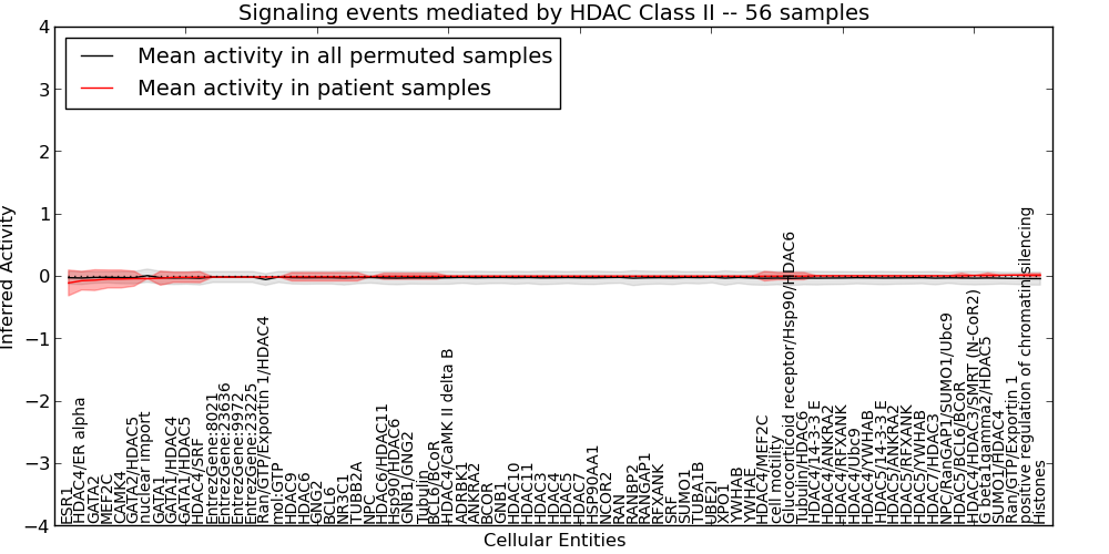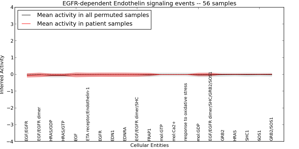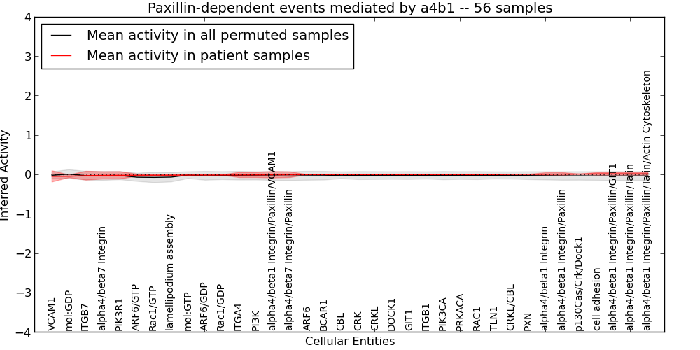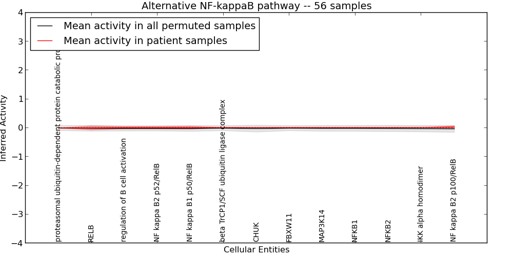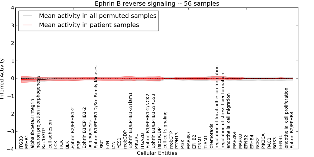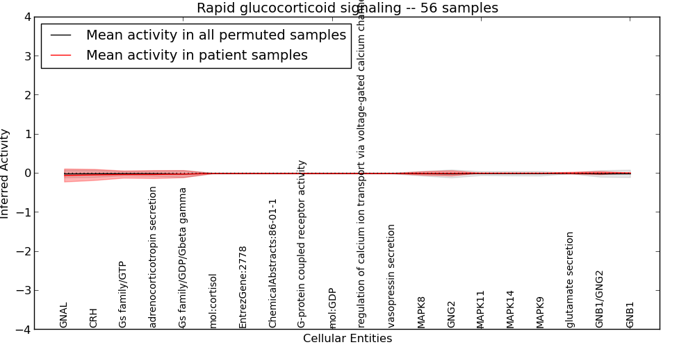 Figure S131. Get High-res Image This plot shows pathway concept perturbations across all samples against a permutation model. The concepts along the x-axis are sorted by lowest to highest mean activity for the real patient samples. Mean inferred activities are plotted along the y-axis as a colored band showing the average level and one standard deviation range. Real samples are shown in red and permuted samples in black.
