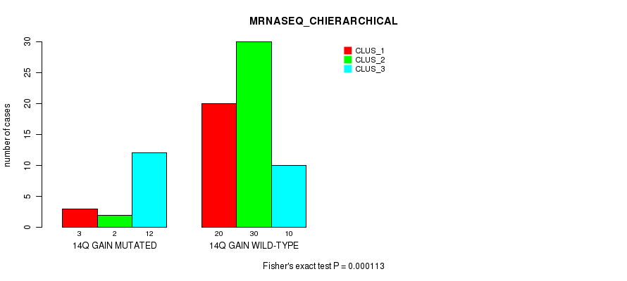 14q gain cnv correlated to 'MRNASEQ_CHIERARCHICAL', 'MIRSEQ_CNMF', 'MIRSEQ_CHIERARCHICAL', 'MIRSEQ_MATURE_CNMF', and 'MIRSEQ_MATURE_CHIERARCHICAL'.