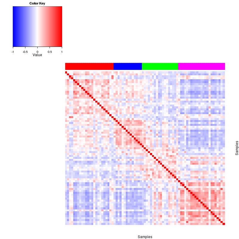 Figure 1.  Get High-res Image Samples were separated into 4 clusters. Shown are 79 samples and 1200 marker genes. The color bar of the row indicates the marker genes for the corresponding cluster.