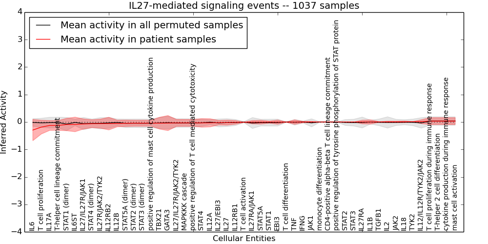 Figure S131. Get High-res Image This plot shows pathway concept perturbations across all samples against a permutation model. The concepts along the x-axis are sorted by lowest to highest mean activity for the real patient samples. Mean inferred activities are plotted along the y-axis as a colored band showing the average level and one standard deviation range. Real samples are shown in red and permuted samples in black.