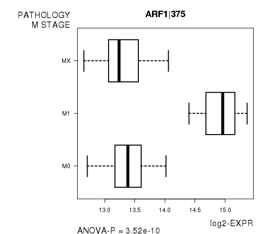 Figure S3. Get High-res Image As an example, this figure shows the association of ARF1|375 to 'PATHOLOGY.M.STAGE'. P value = 3.52e-10 with ANOVA analysis.