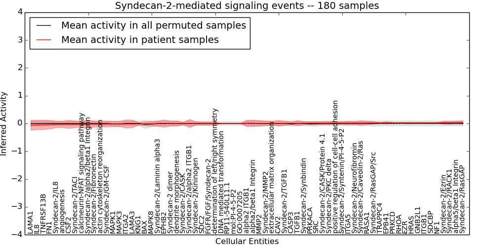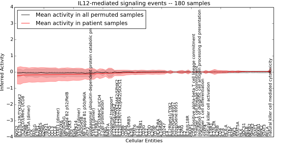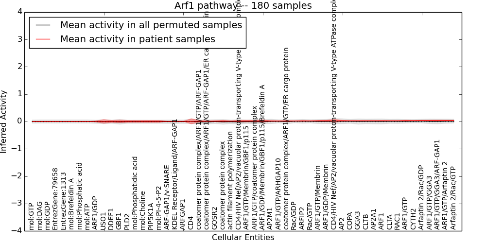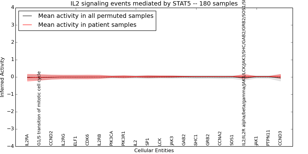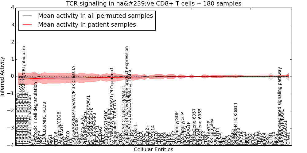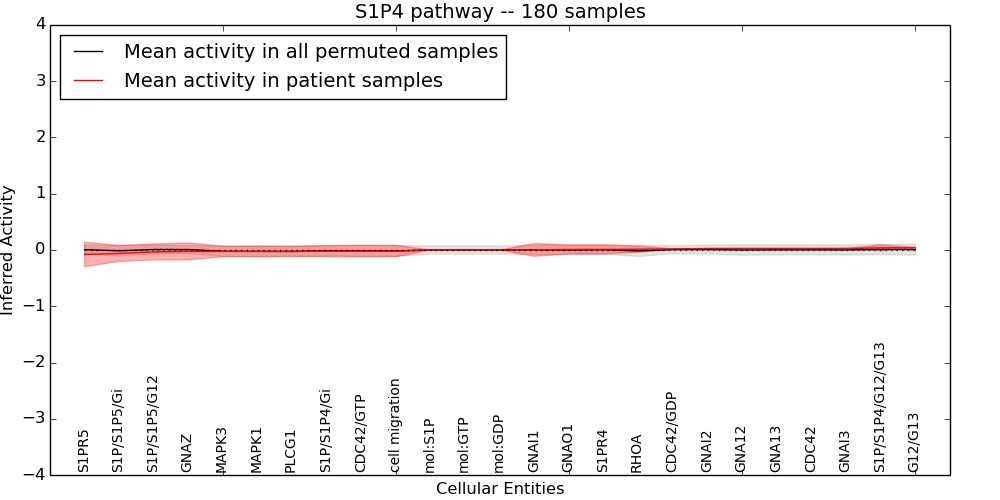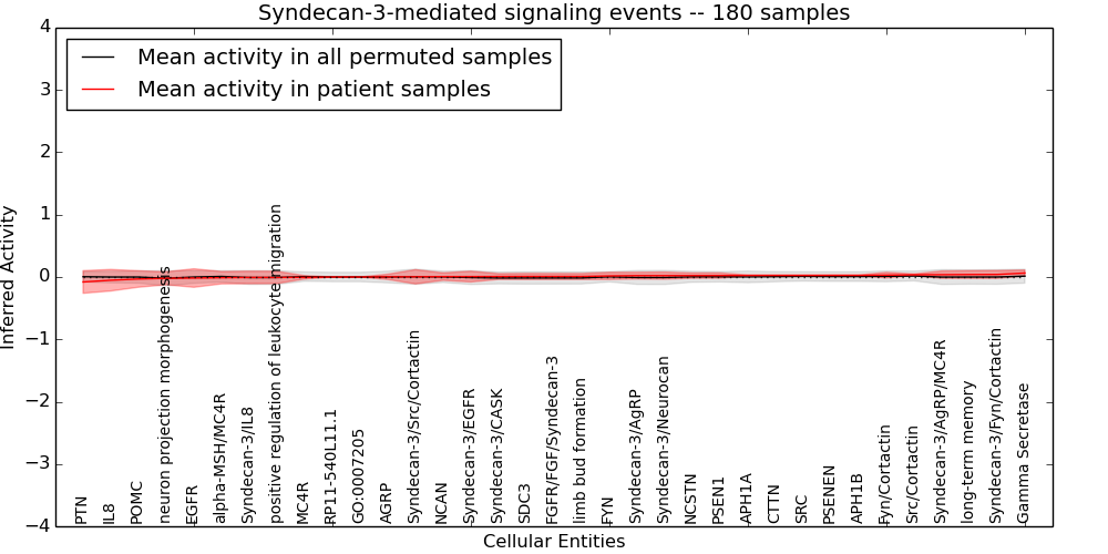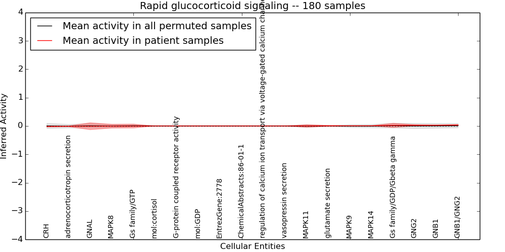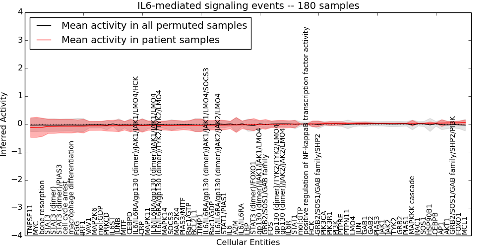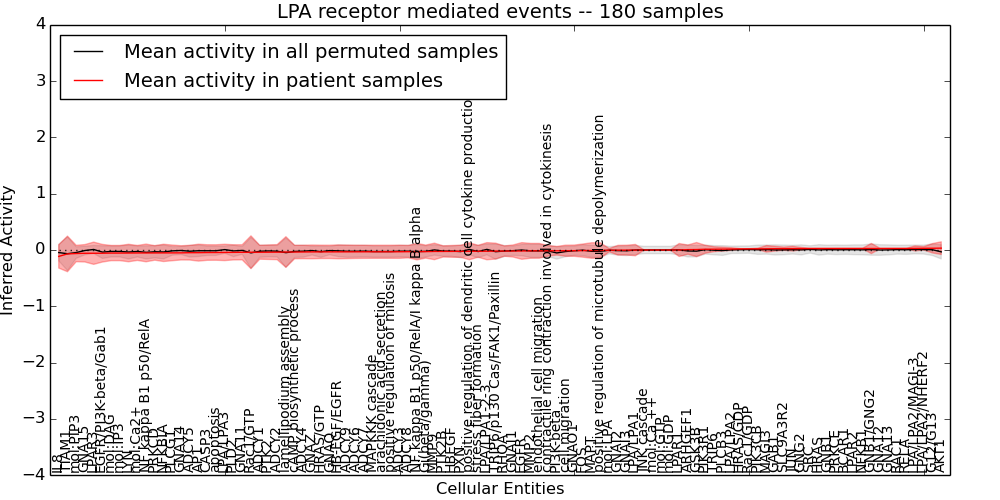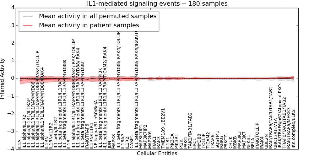 Figure S130. Get High-res Image This plot shows pathway concept perturbations across all samples against a permutation model. The concepts along the x-axis are sorted by lowest to highest mean activity for the real patient samples. Mean inferred activities are plotted along the y-axis as a colored band showing the average level and one standard deviation range. Real samples are shown in red and permuted samples in black.