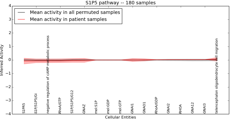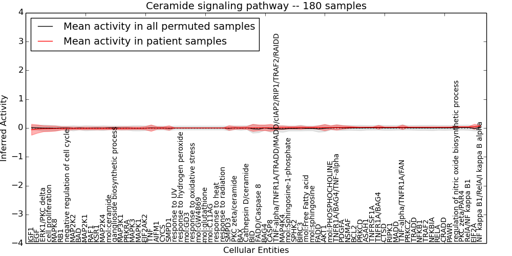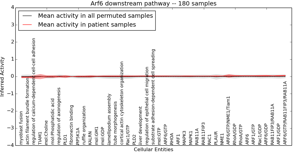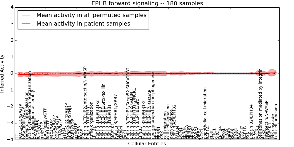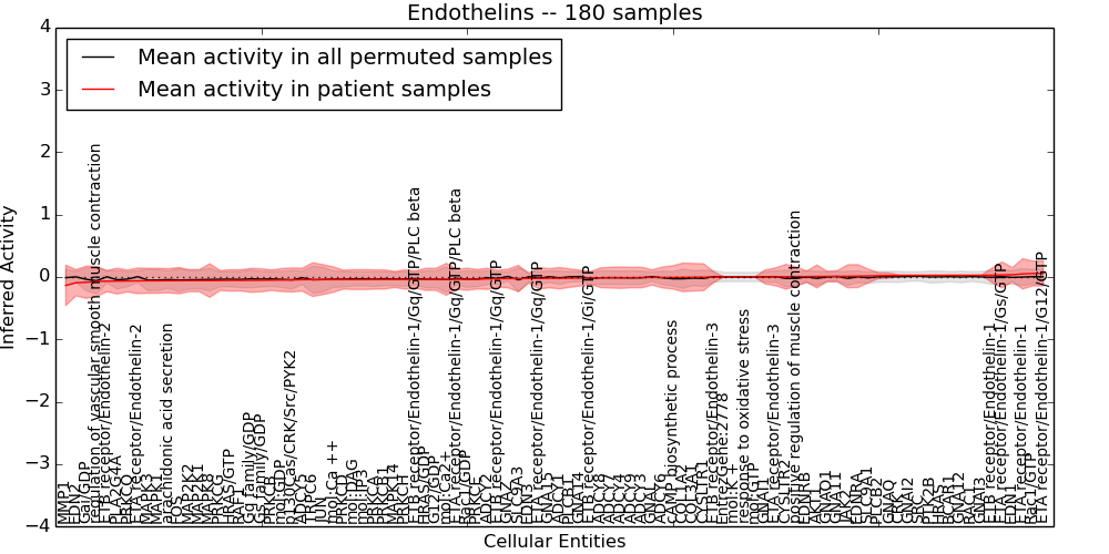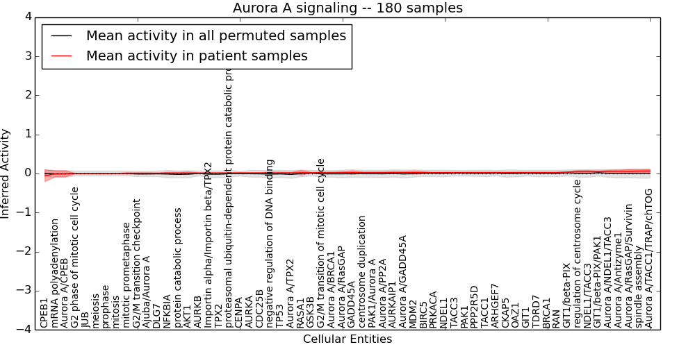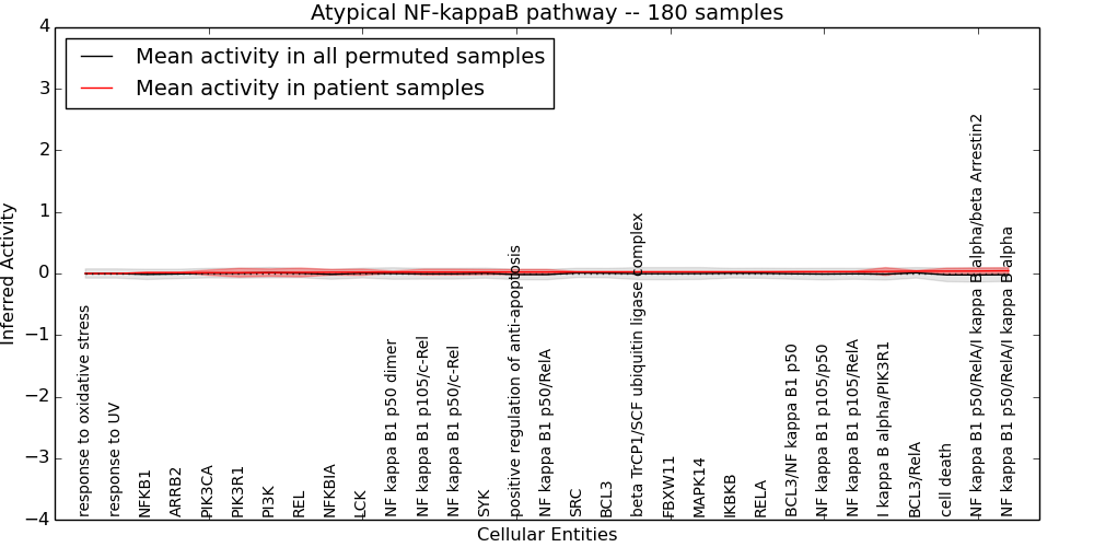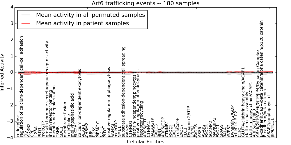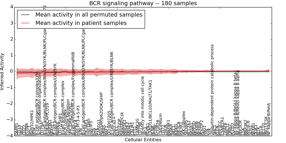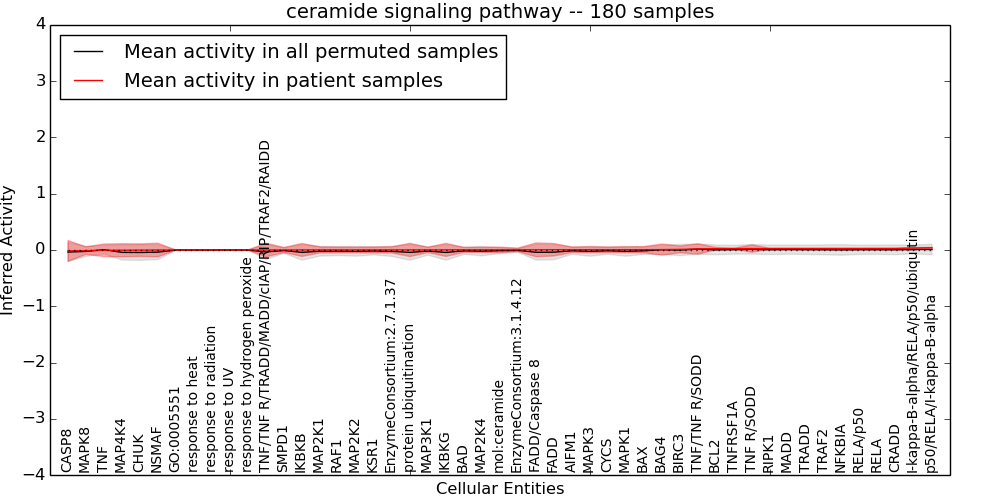 Figure S130. Get High-res Image This plot shows pathway concept perturbations across all samples against a permutation model. The concepts along the x-axis are sorted by lowest to highest mean activity for the real patient samples. Mean inferred activities are plotted along the y-axis as a colored band showing the average level and one standard deviation range. Real samples are shown in red and permuted samples in black.