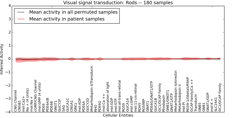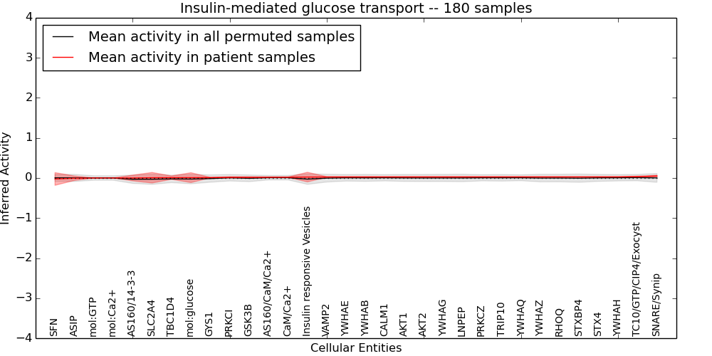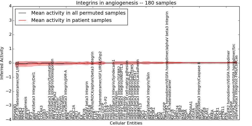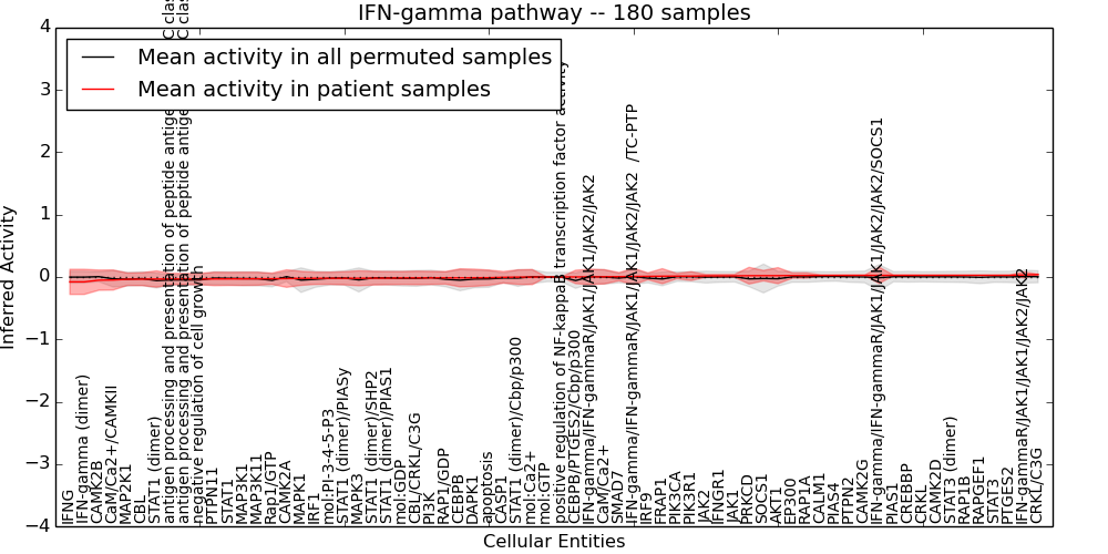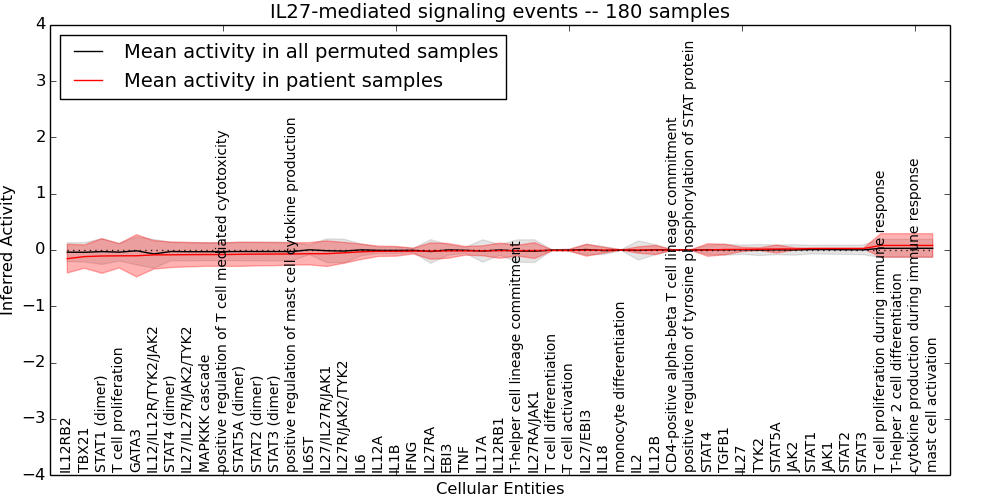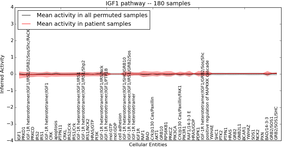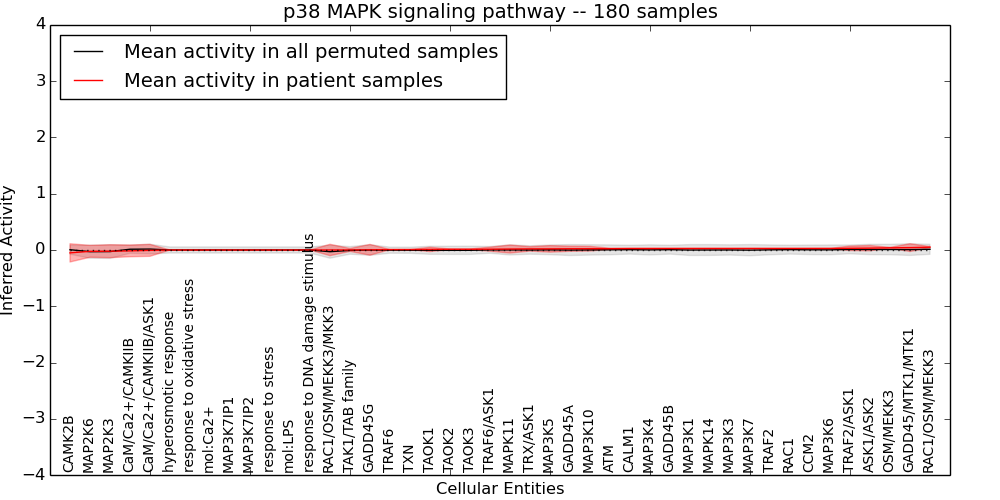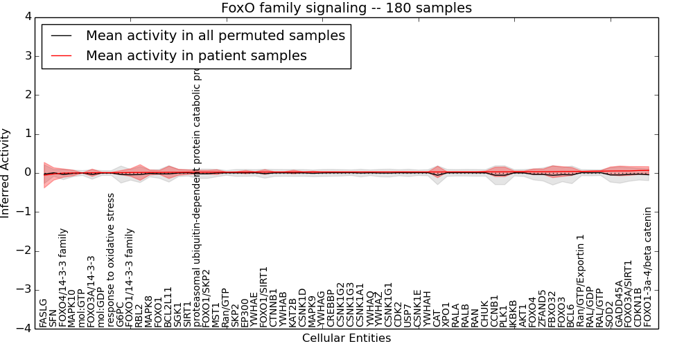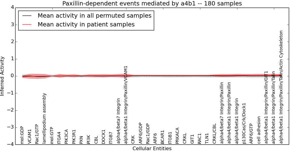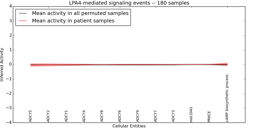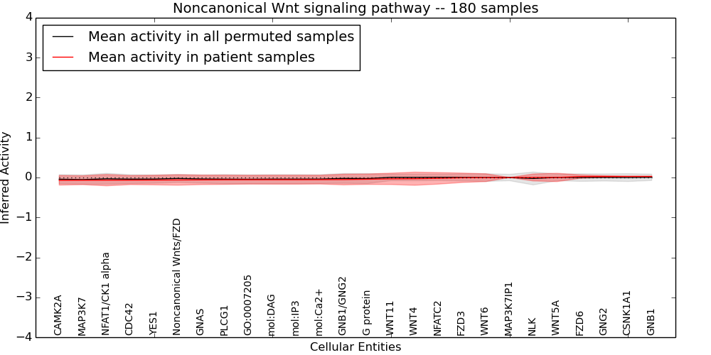 Figure S130. Get High-res Image This plot shows pathway concept perturbations across all samples against a permutation model. The concepts along the x-axis are sorted by lowest to highest mean activity for the real patient samples. Mean inferred activities are plotted along the y-axis as a colored band showing the average level and one standard deviation range. Real samples are shown in red and permuted samples in black.