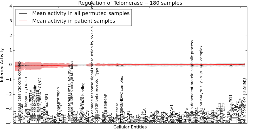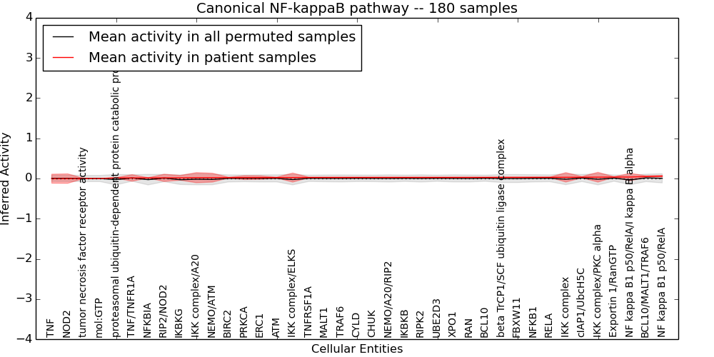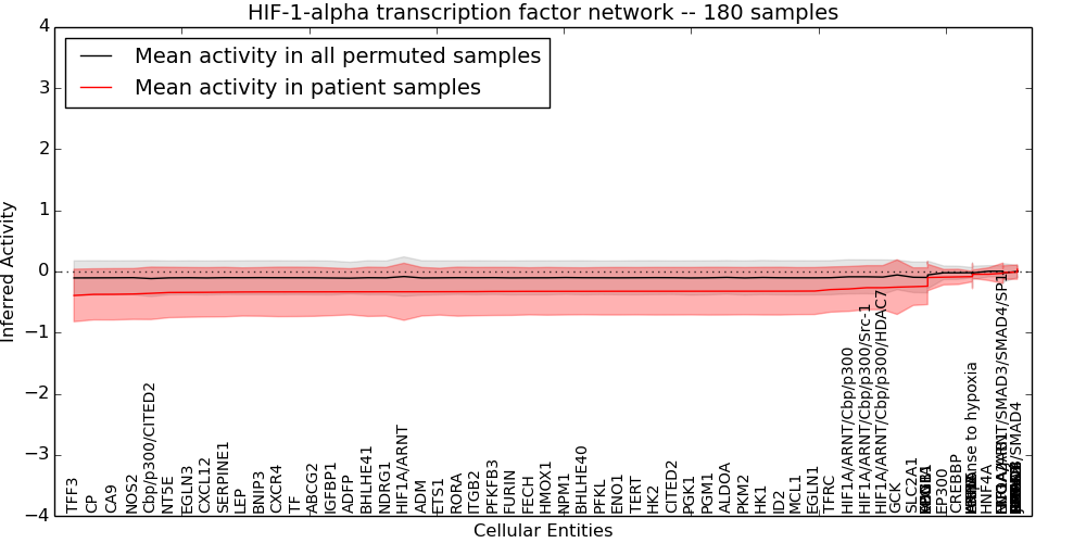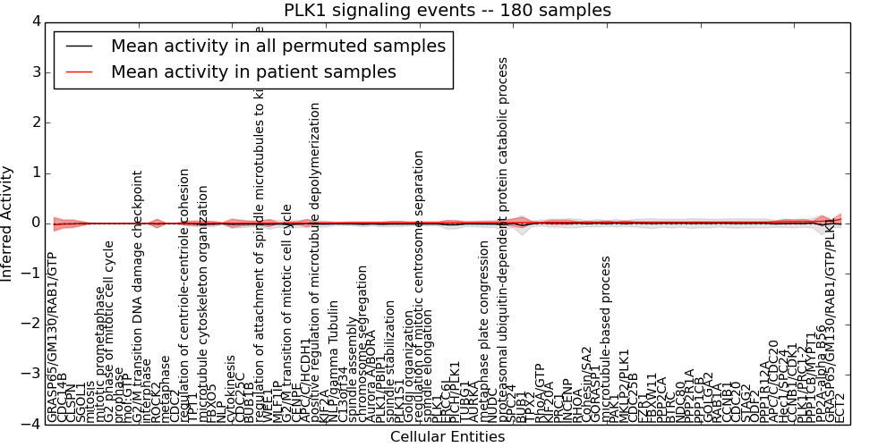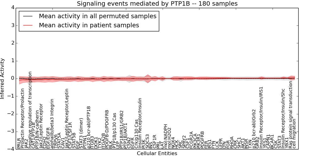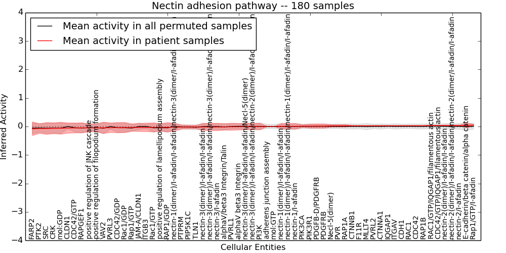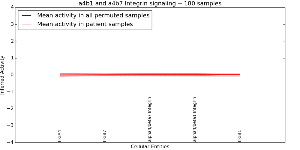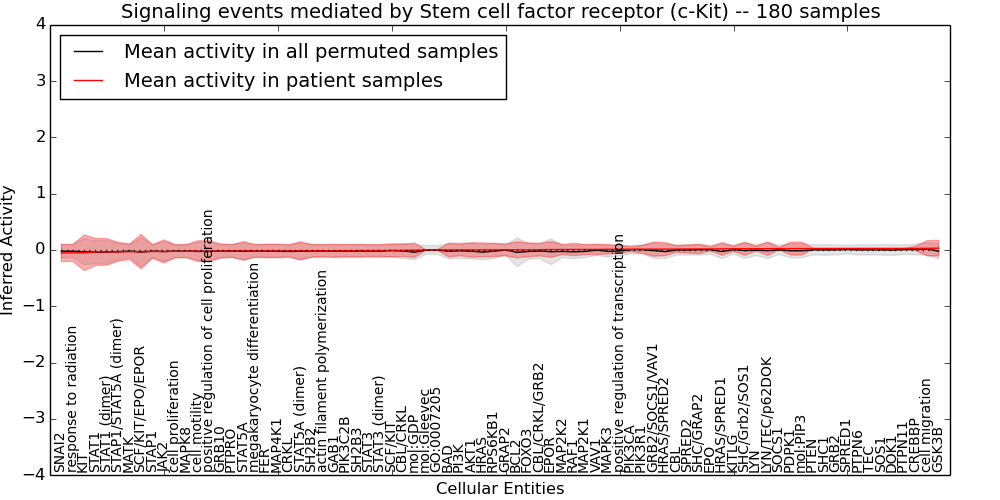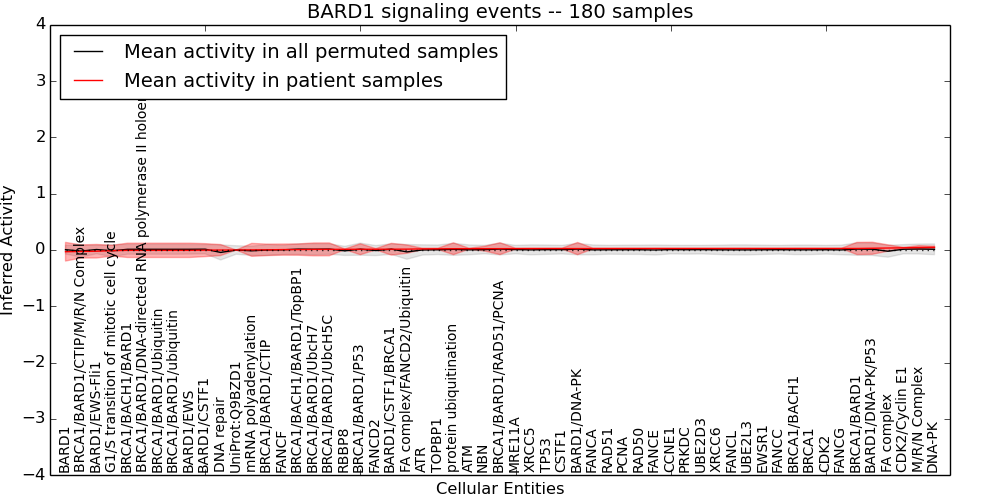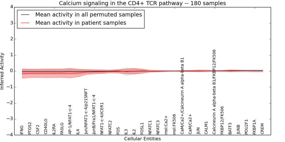 Figure S130. Get High-res Image This plot shows pathway concept perturbations across all samples against a permutation model. The concepts along the x-axis are sorted by lowest to highest mean activity for the real patient samples. Mean inferred activities are plotted along the y-axis as a colored band showing the average level and one standard deviation range. Real samples are shown in red and permuted samples in black.