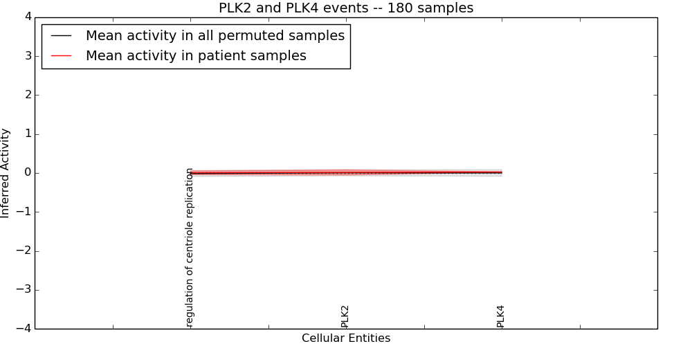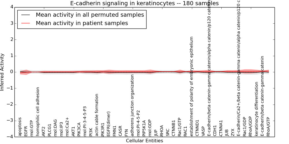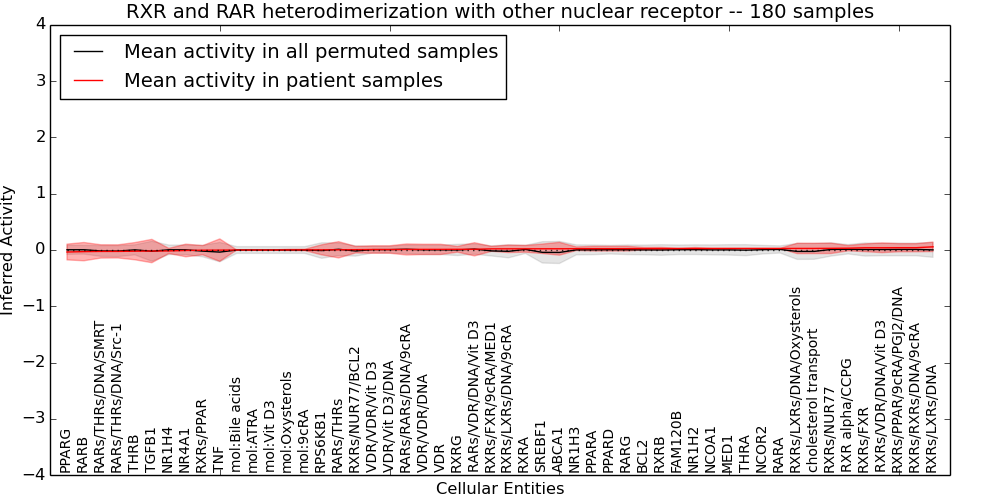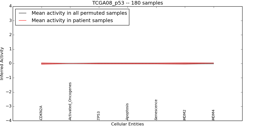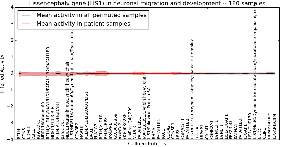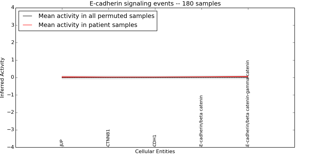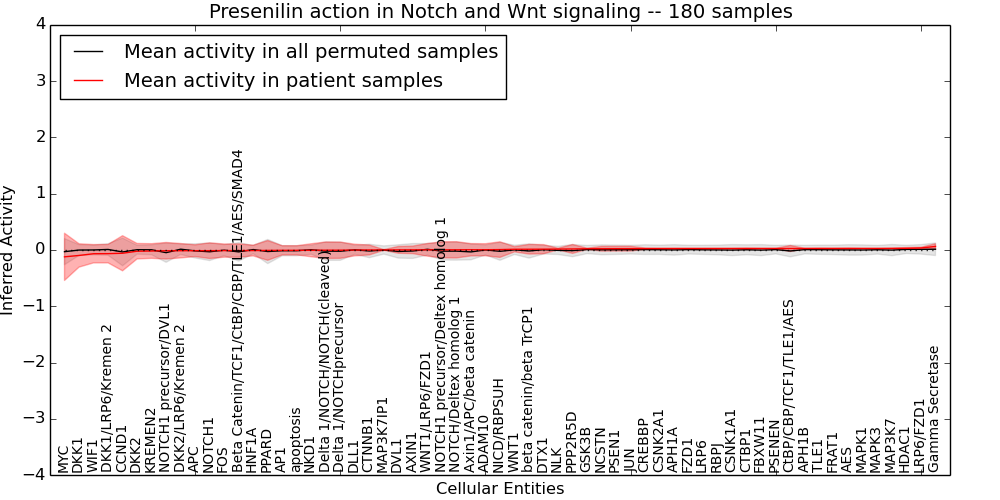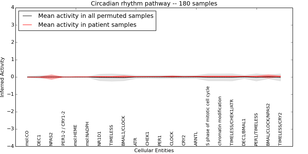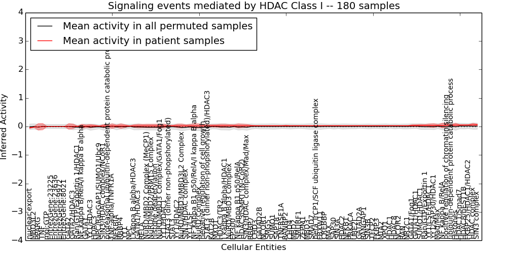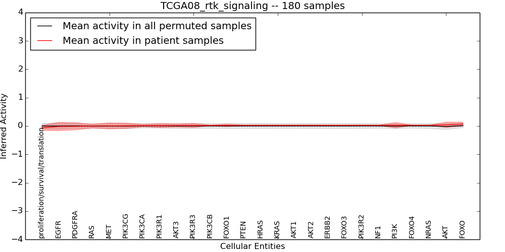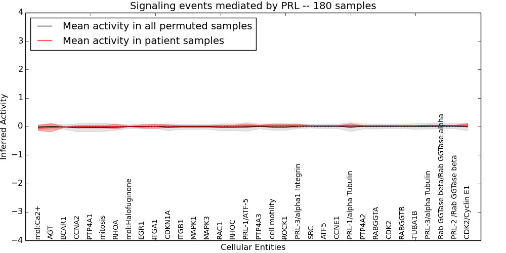Figure S130. Get High-res Image This plot shows pathway concept perturbations across all samples against a permutation model. The concepts along the x-axis are sorted by lowest to highest mean activity for the real patient samples. Mean inferred activities are plotted along the y-axis as a colored band showing the average level and one standard deviation range. Real samples are shown in red and permuted samples in black.