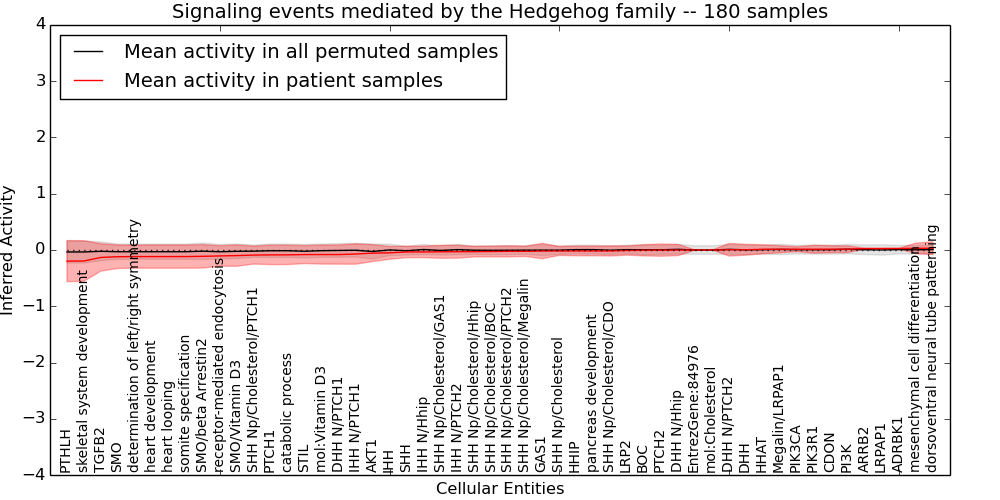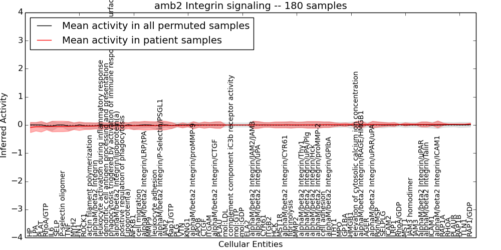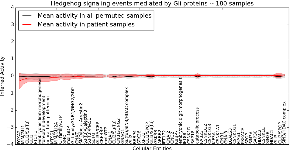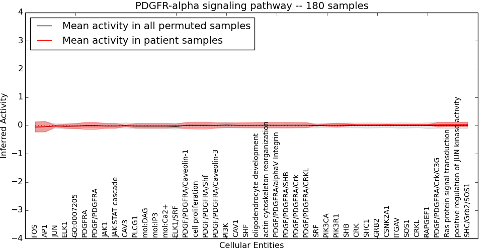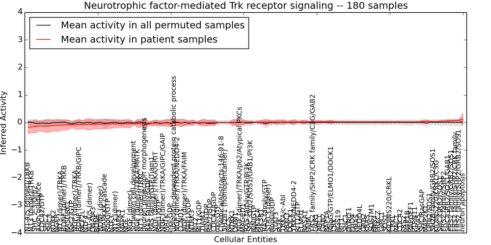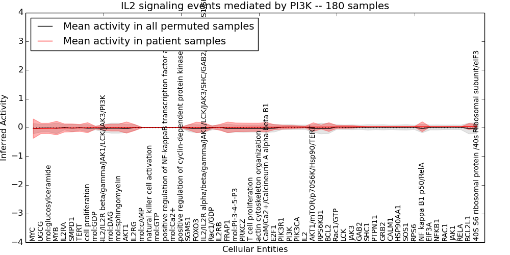 Figure S131. Get High-res Image This plot shows pathway concept perturbations across all samples against a permutation model. The concepts along the x-axis are sorted by lowest to highest mean activity for the real patient samples. Mean inferred activities are plotted along the y-axis as a colored band showing the average level and one standard deviation range. Real samples are shown in red and permuted samples in black.