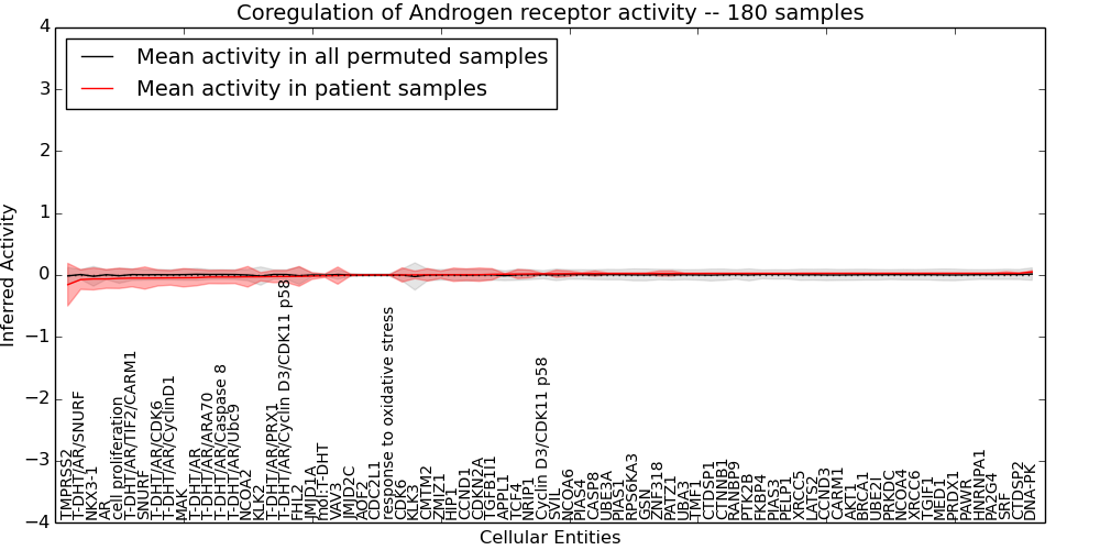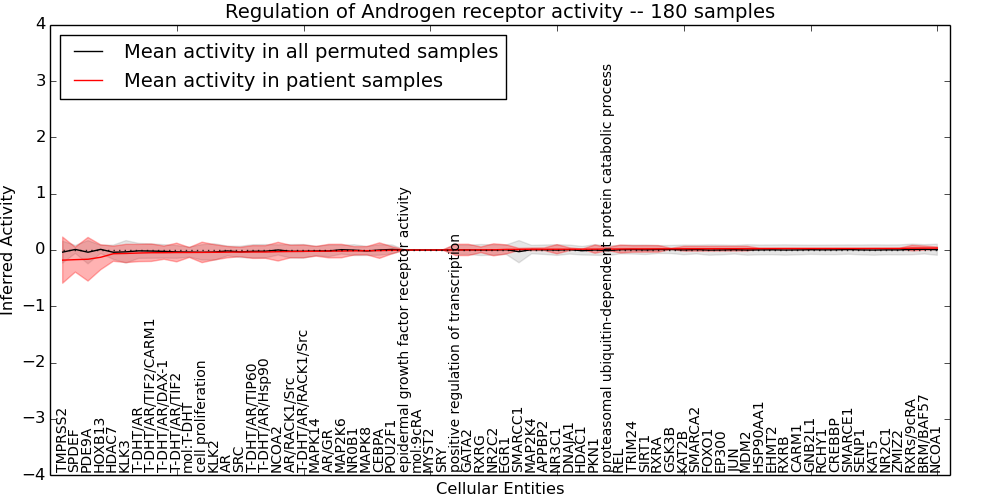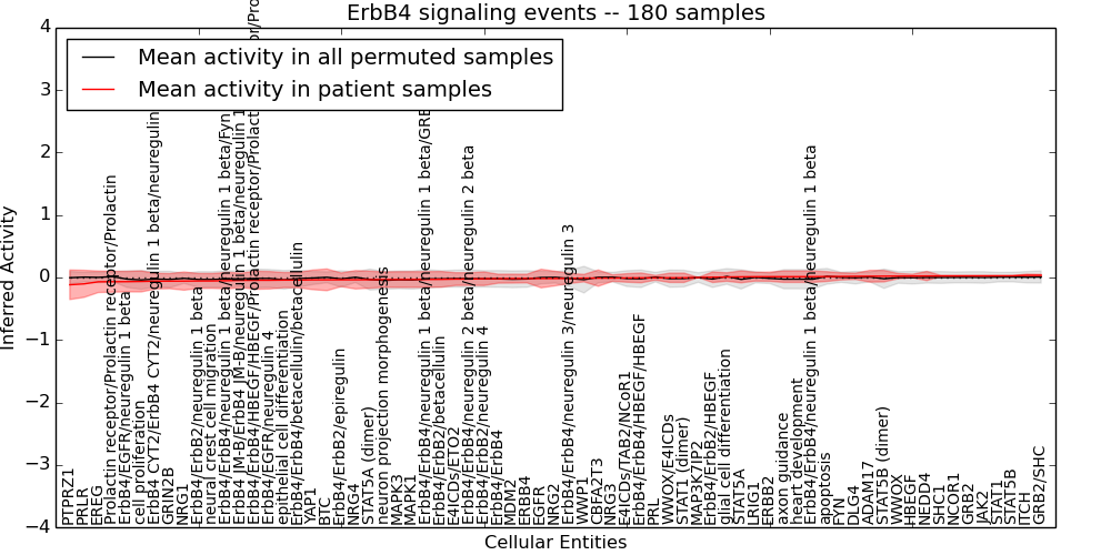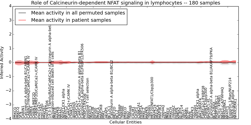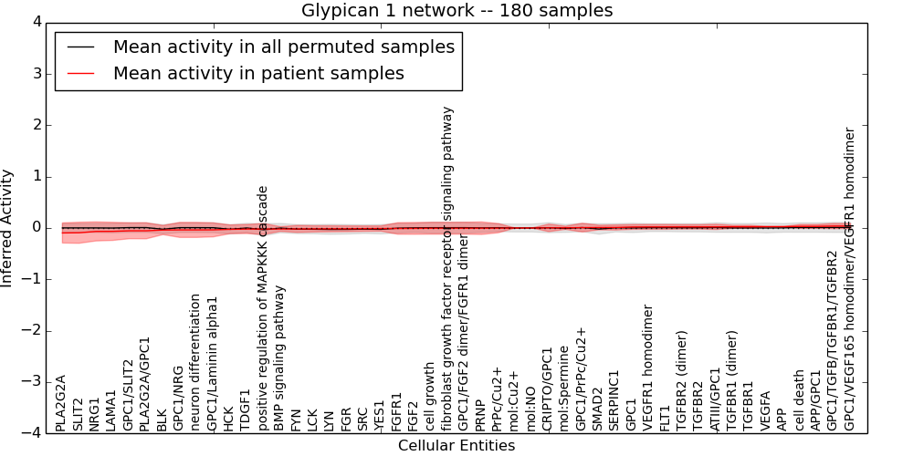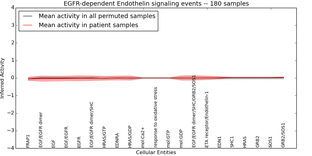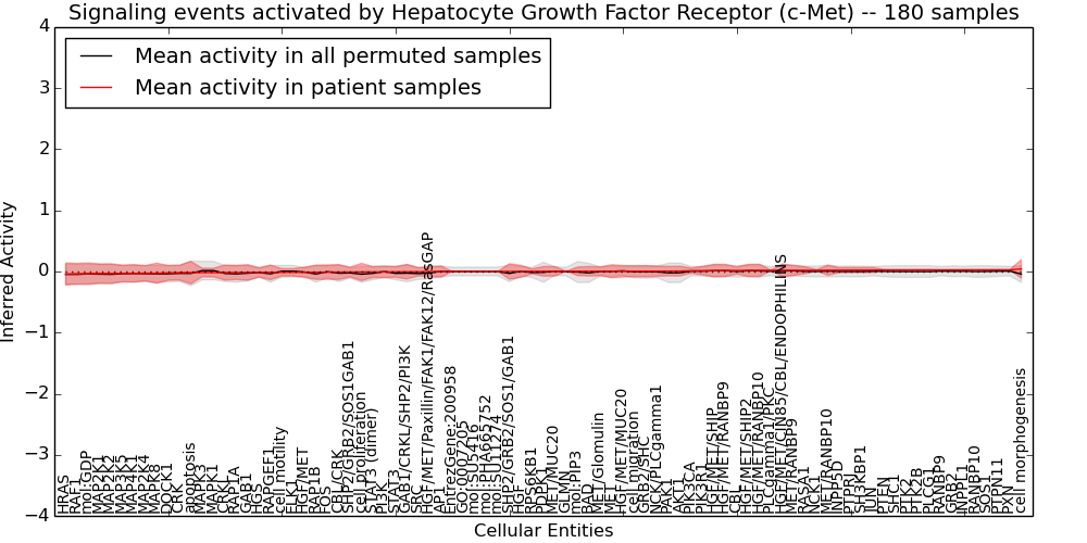 Figure S131. Get High-res Image This plot shows pathway concept perturbations across all samples against a permutation model. The concepts along the x-axis are sorted by lowest to highest mean activity for the real patient samples. Mean inferred activities are plotted along the y-axis as a colored band showing the average level and one standard deviation range. Real samples are shown in red and permuted samples in black.