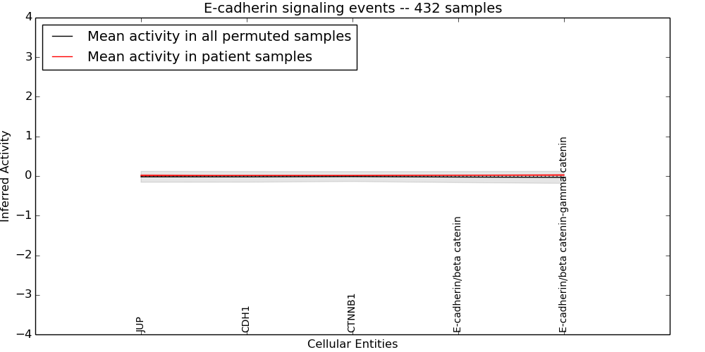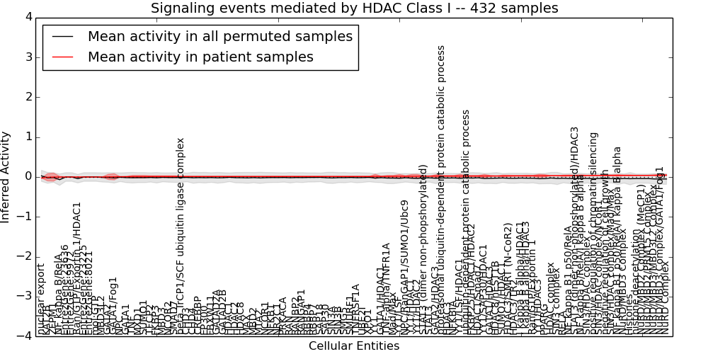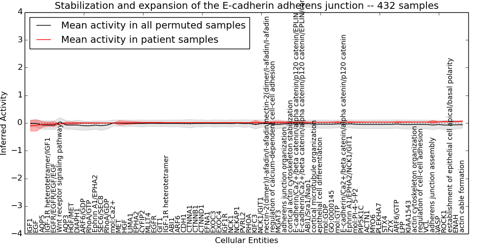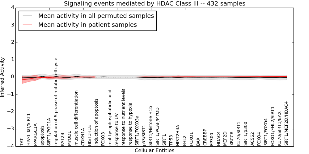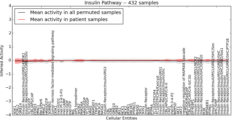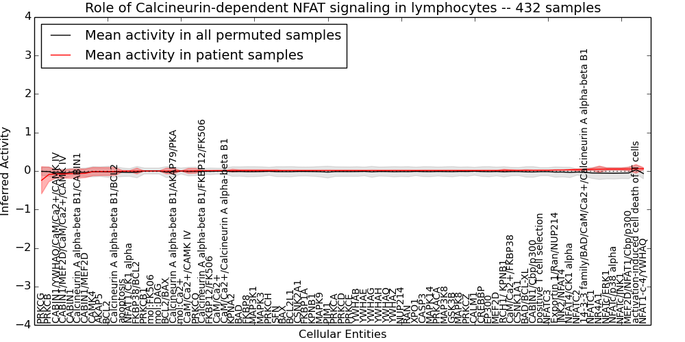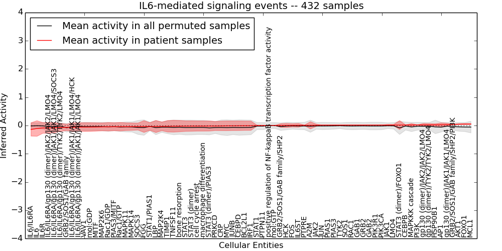Figure S131. Get High-res Image This plot shows pathway concept perturbations across all samples against a permutation model. The concepts along the x-axis are sorted by lowest to highest mean activity for the real patient samples. Mean inferred activities are plotted along the y-axis as a colored band showing the average level and one standard deviation range. Real samples are shown in red and permuted samples in black.