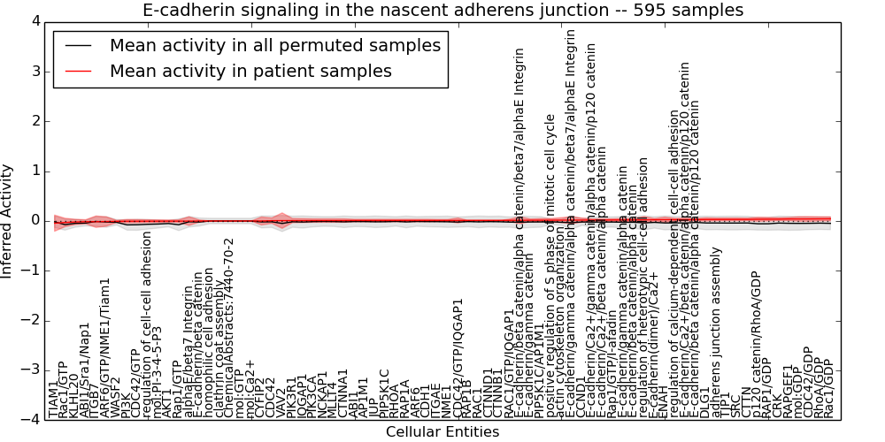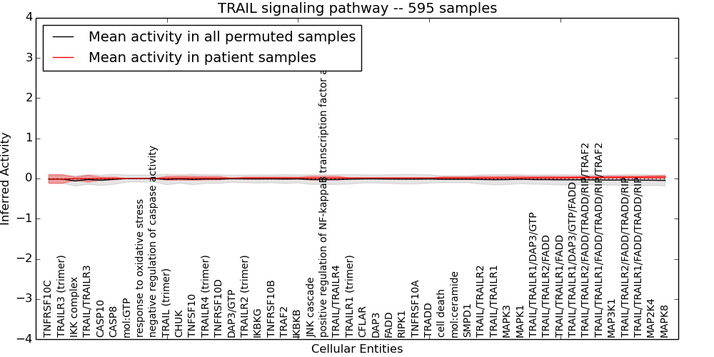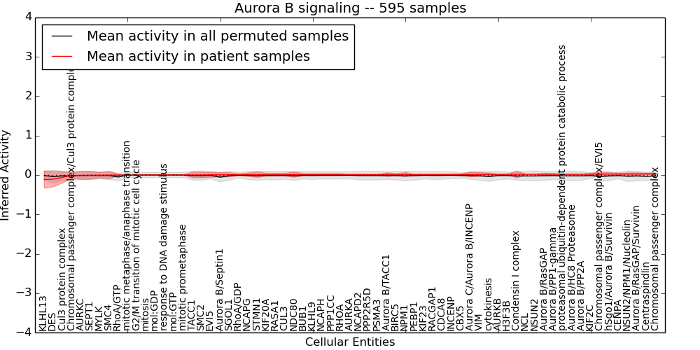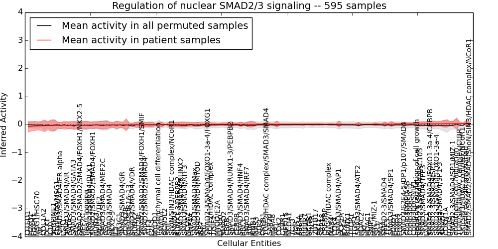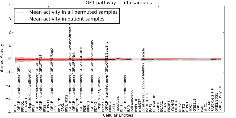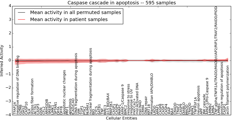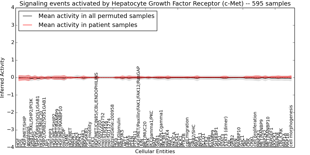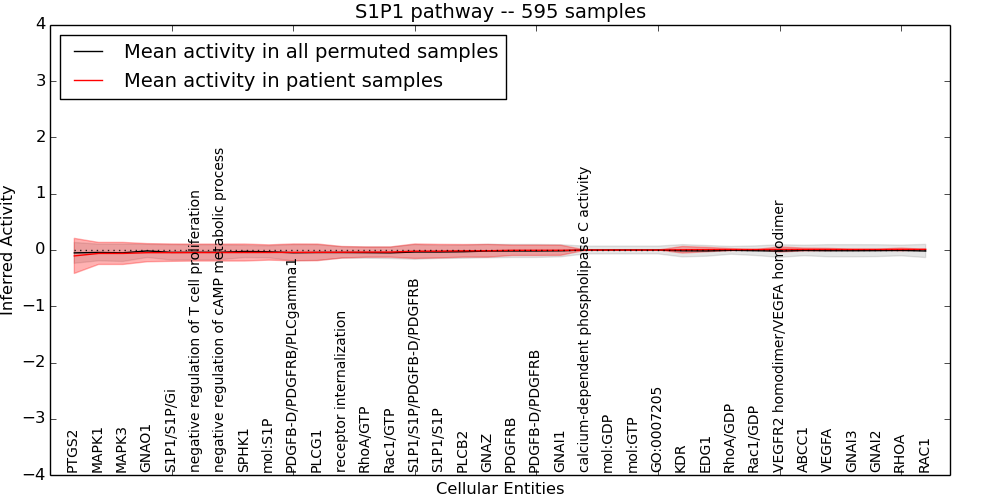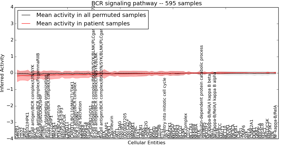 Figure S131.  Get High-res Image This plot shows pathway concept perturbations across all samples against a permutation model. The concepts along the x-axis are sorted by lowest to highest mean activity for the real patient samples. Mean inferred activities are plotted along the y-axis as a colored band showing the average level and one standard deviation range. Real samples are shown in red and permuted samples in black.