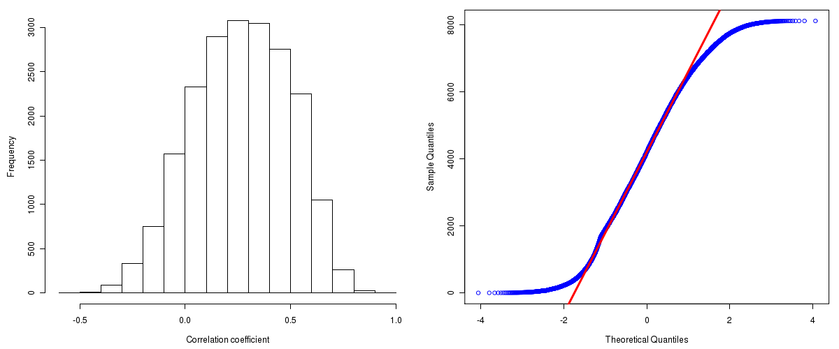 Figure 1. Summary figures. Left: histogram showing the distribution of the calculated correlations across samples for all Genes. Right: QQ plot of the calculated correlations across samples. The QQ plot is used to plot the quantiles of the calculated correlation coefficients against that derived from a normal distribution. Points deviating from the blue line indicate deviation from normality.
