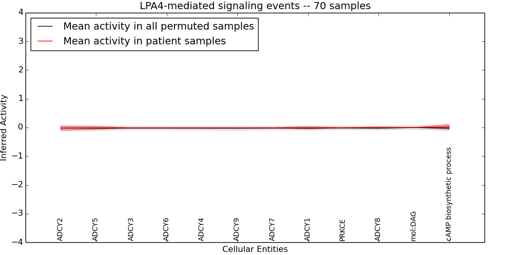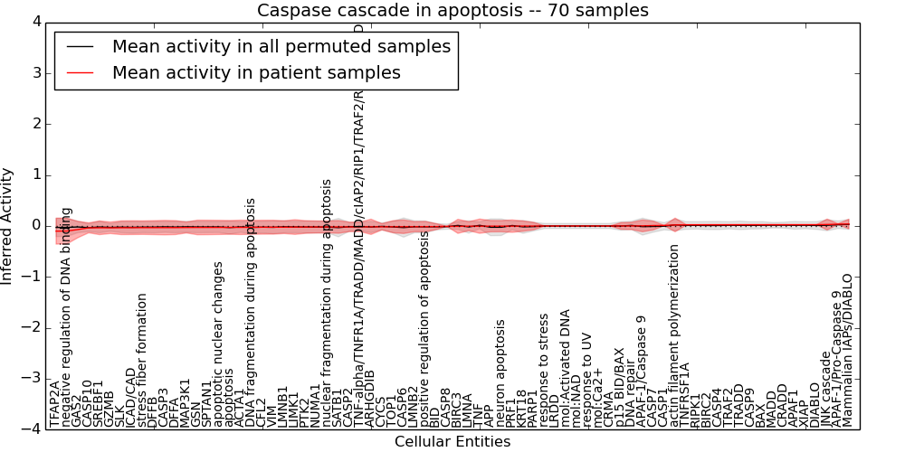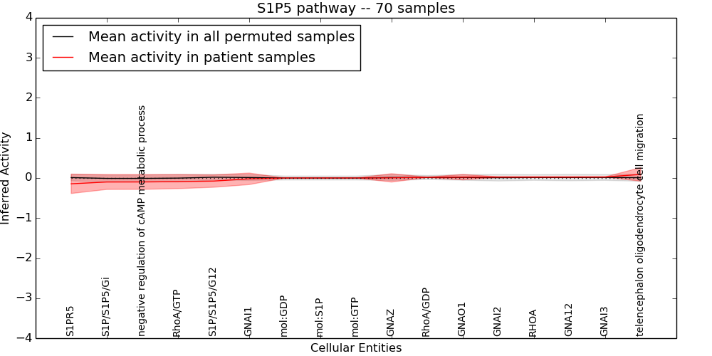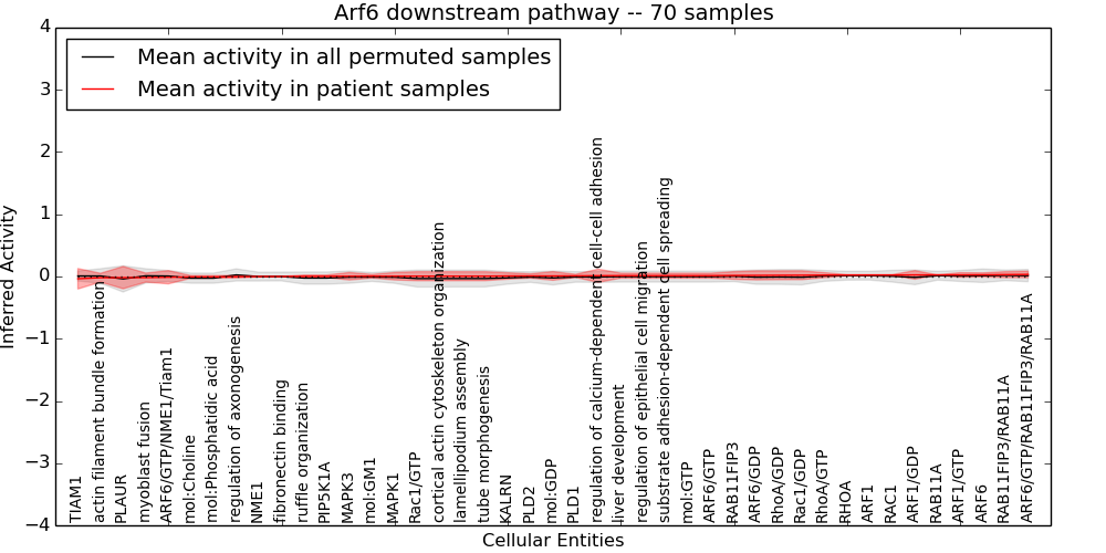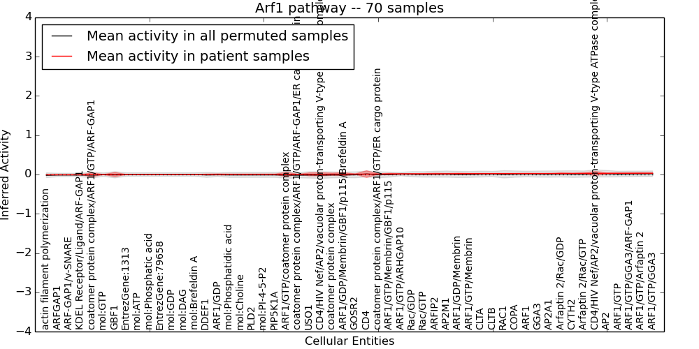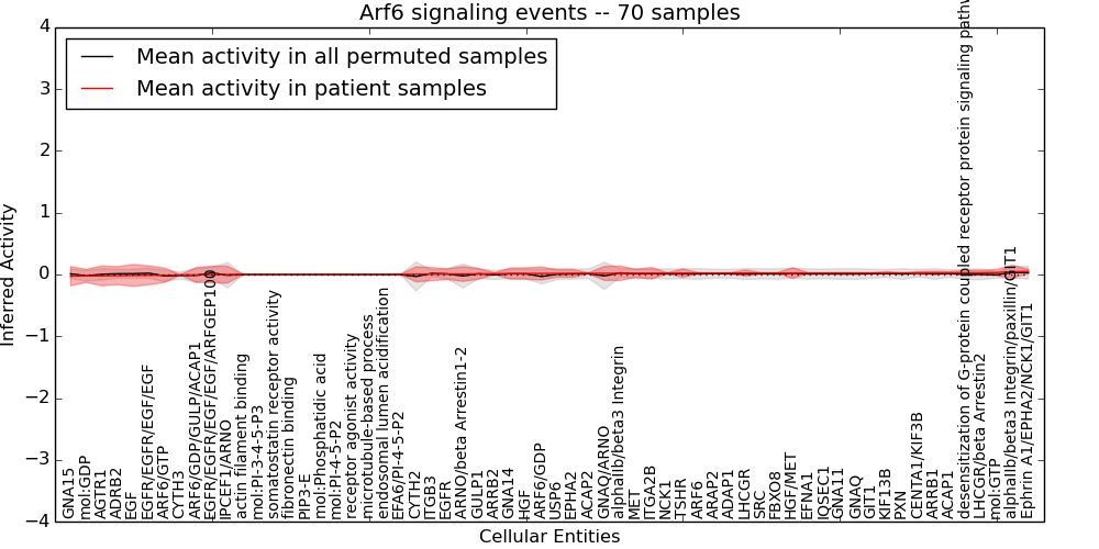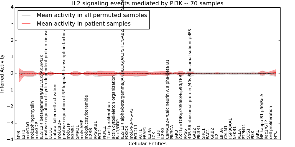 Figure S130. Get High-res Image This plot shows pathway concept perturbations across all samples against a permutation model. The concepts along the x-axis are sorted by lowest to highest mean activity for the real patient samples. Mean inferred activities are plotted along the y-axis as a colored band showing the average level and one standard deviation range. Real samples are shown in red and permuted samples in black.