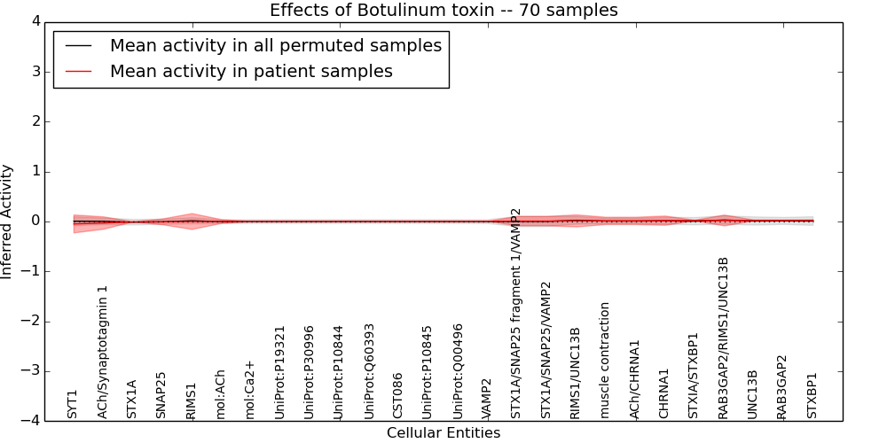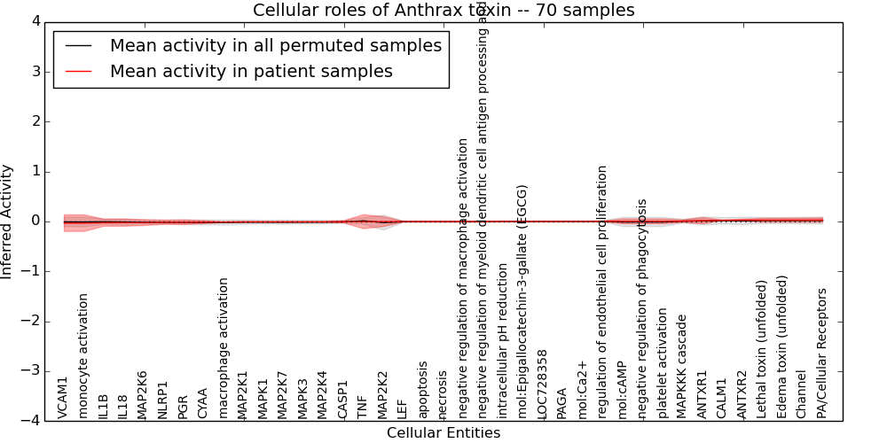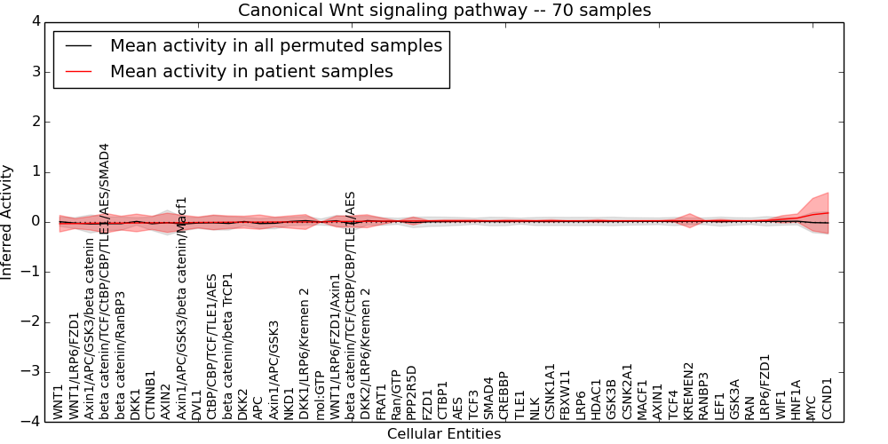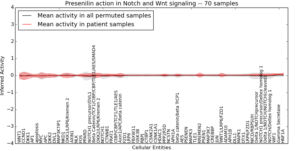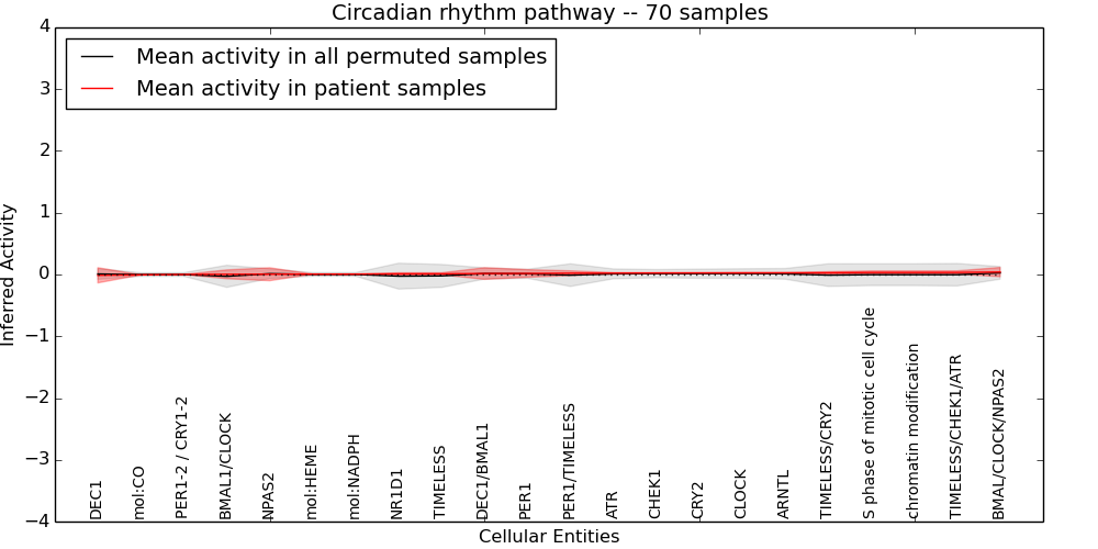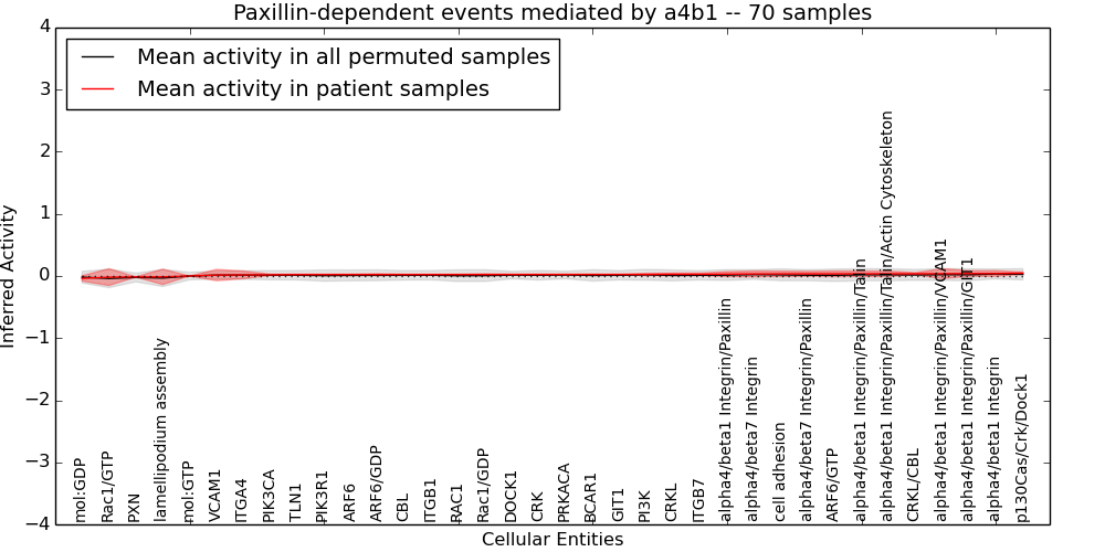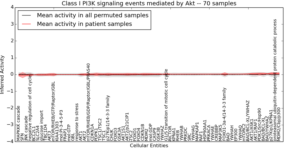 Figure S130. Get High-res Image This plot shows pathway concept perturbations across all samples against a permutation model. The concepts along the x-axis are sorted by lowest to highest mean activity for the real patient samples. Mean inferred activities are plotted along the y-axis as a colored band showing the average level and one standard deviation range. Real samples are shown in red and permuted samples in black.
