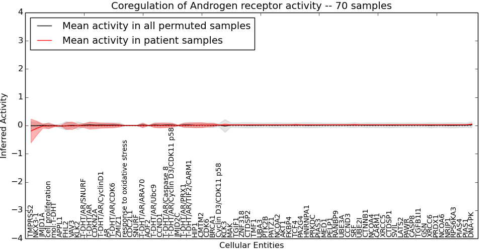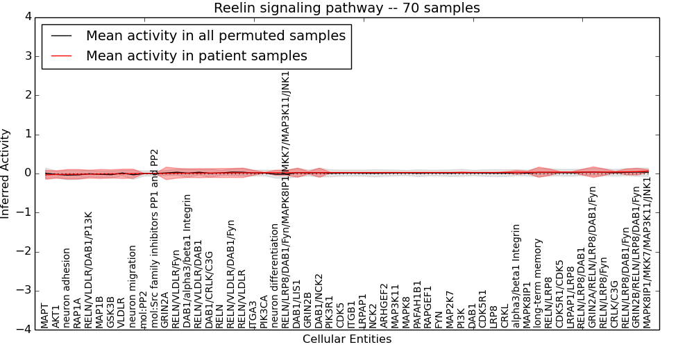 Figure S131. Get High-res Image This plot shows pathway concept perturbations across all samples against a permutation model. The concepts along the x-axis are sorted by lowest to highest mean activity for the real patient samples. Mean inferred activities are plotted along the y-axis as a colored band showing the average level and one standard deviation range. Real samples are shown in red and permuted samples in black.