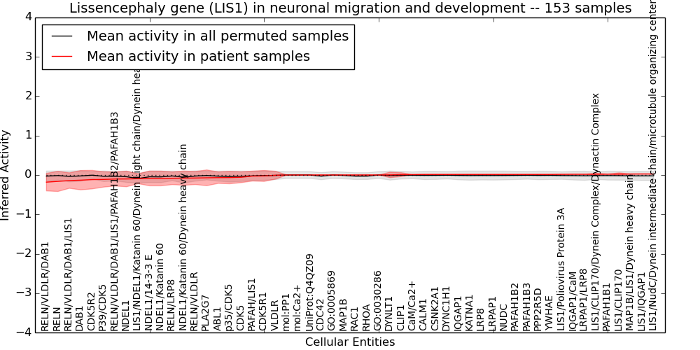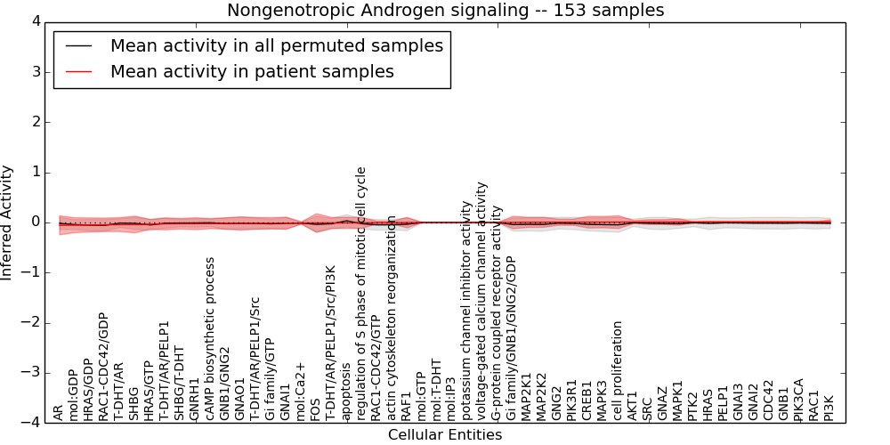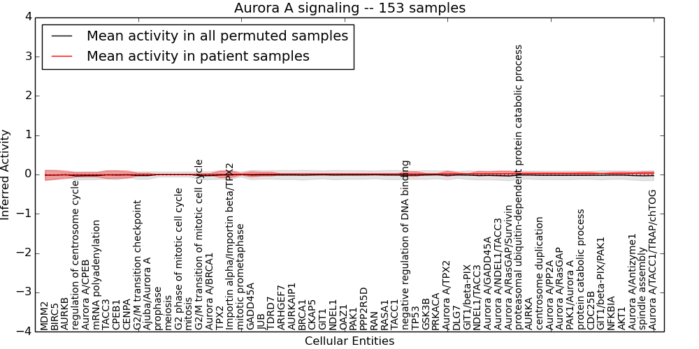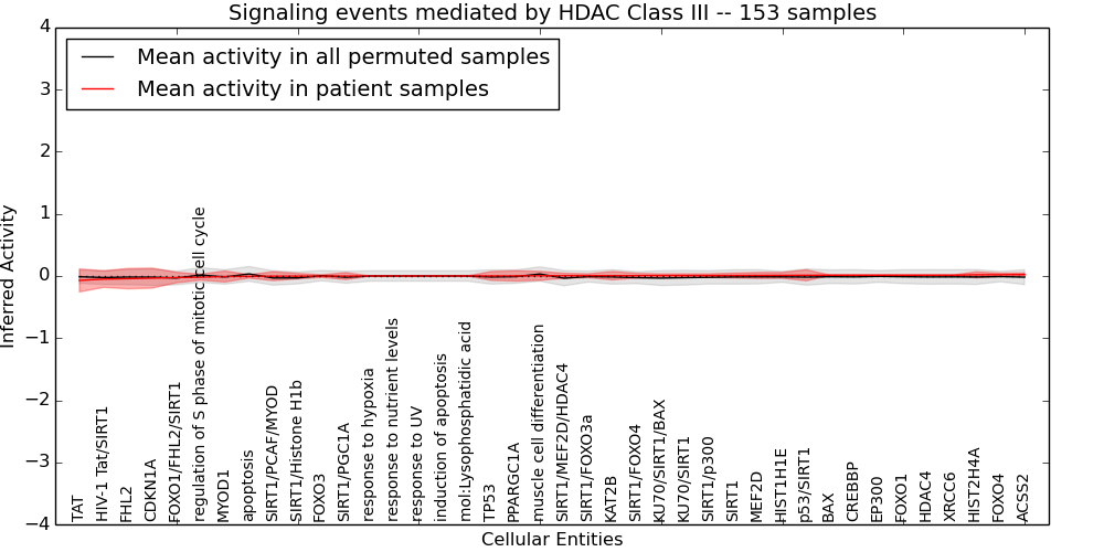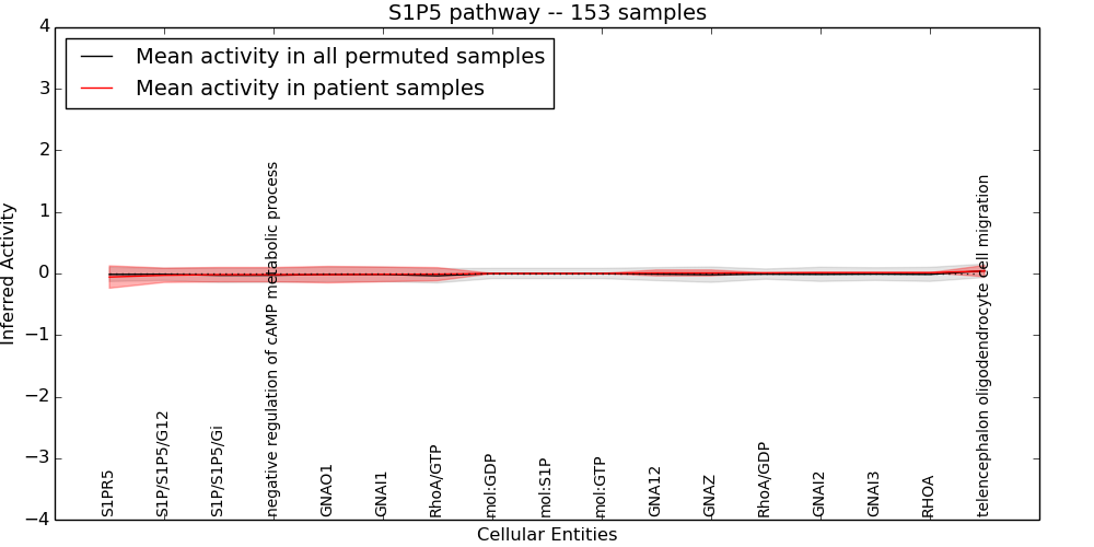 Figure S131. Get High-res Image This plot shows pathway concept perturbations across all samples against a permutation model. The concepts along the x-axis are sorted by lowest to highest mean activity for the real patient samples. Mean inferred activities are plotted along the y-axis as a colored band showing the average level and one standard deviation range. Real samples are shown in red and permuted samples in black.