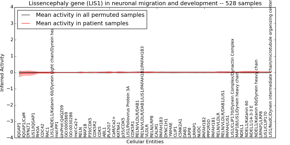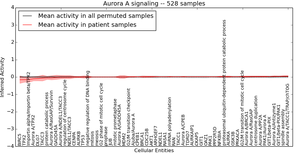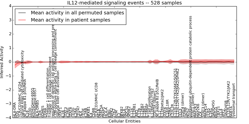 Figure S128. Get High-res Image This plot shows pathway concept perturbations across all samples against a permutation model. The concepts along the x-axis are sorted by lowest to highest mean activity for the real patient samples. Mean inferred activities are plotted along the y-axis as a colored band showing the average level and one standard deviation range. Real samples are shown in red and permuted samples in black.