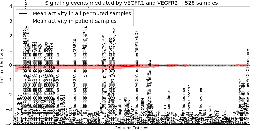 Figure S131. Get High-res Image This plot shows pathway concept perturbations across all samples against a permutation model. The concepts along the x-axis are sorted by lowest to highest mean activity for the real patient samples. Mean inferred activities are plotted along the y-axis as a colored band showing the average level and one standard deviation range. Real samples are shown in red and permuted samples in black.