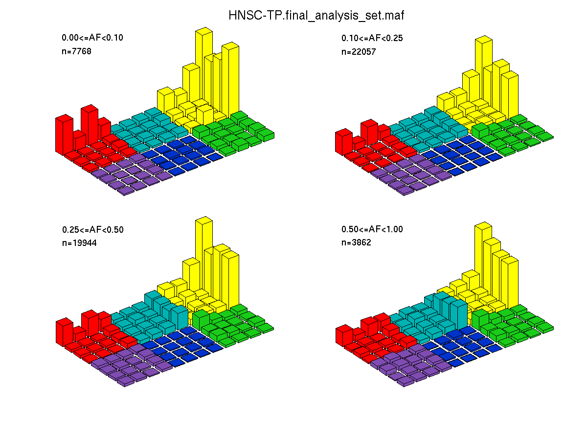 The mutation spectrum is depicted in the lego plots below in which the 96 possible mutation types are subdivided into six large blocks, color-coded to reflect the base substitution type. Each large block is further subdivided into the 16 possible pairs of 5' and 3' neighbors, as listed in the 4x4 trinucleotide context legend. The height of each block corresponds to the mutation frequency for that kind of mutation (counts of mutations normalized by the base coverage in a given bin). The shape of the spectrum is a signature for dominant mutational mechanisms in different tumor types.
