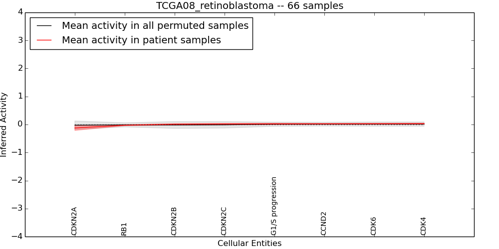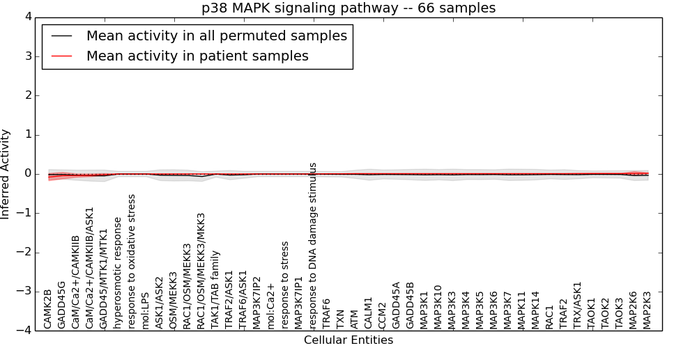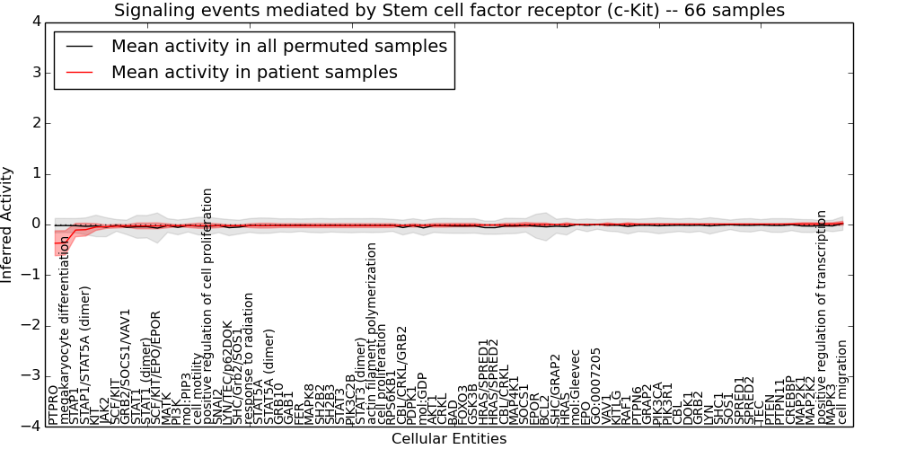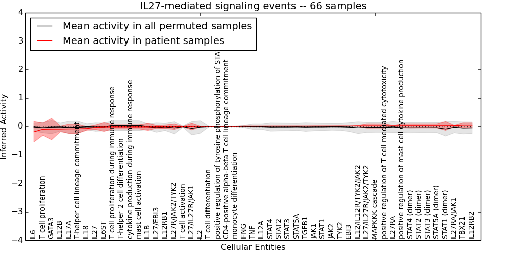 Figure S131. Get High-res Image This plot shows pathway concept perturbations across all samples against a permutation model. The concepts along the x-axis are sorted by lowest to highest mean activity for the real patient samples. Mean inferred activities are plotted along the y-axis as a colored band showing the average level and one standard deviation range. Real samples are shown in red and permuted samples in black.