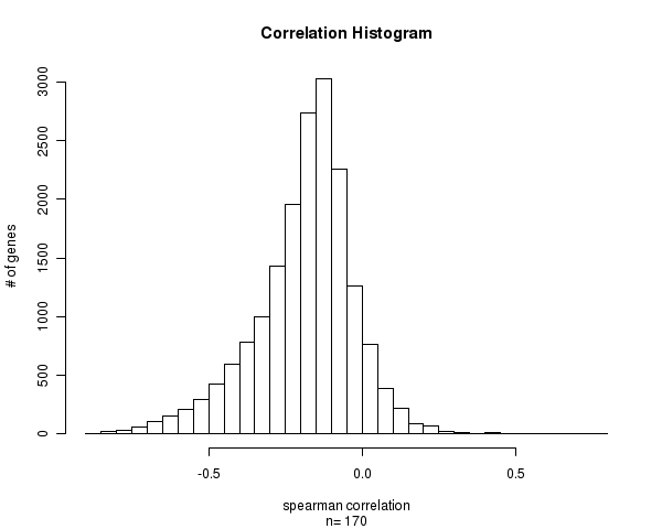 Figure 1. Histogram of methylation correlation values. n is the number of matched samples between Level 3 CpG site methylation and Level 3 gene expression arrays. Number of Matched Samples = 170