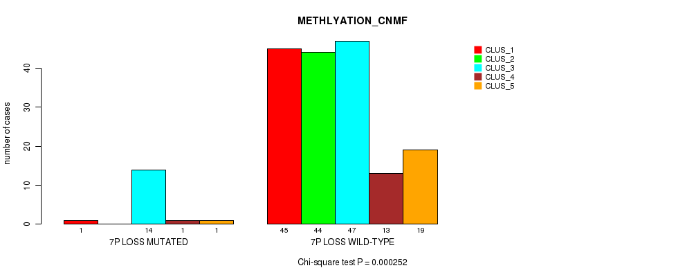 7p loss cnv correlated to 'CN_CNMF', 'METHLYATION_CNMF', 'MRNASEQ_CNMF', 'MRNASEQ_CHIERARCHICAL', and 'MIRSEQ_CHIERARCHICAL'.