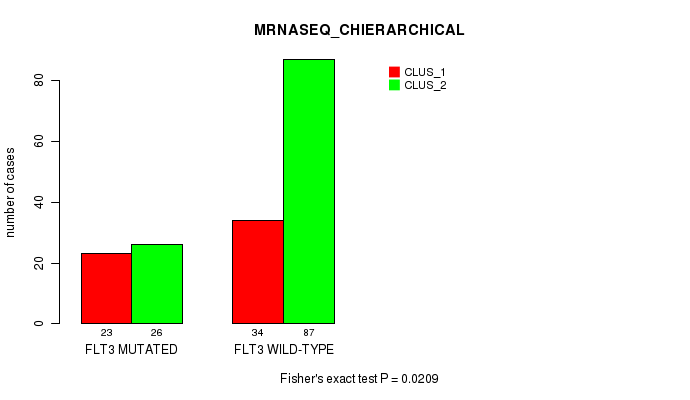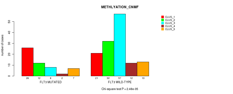 • FLT3 mutation correlated to 'CN_CNMF',  'METHLYATION_CNMF',  'MRNASEQ_CNMF',  'MIRSEQ_CNMF', and 'MIRSEQ_CHIERARCHICAL'.