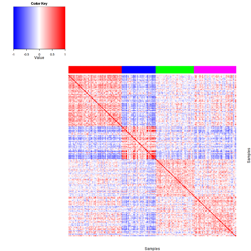 Figure 4.  The consensus matrix after clustering shows 4 robust clusters with limited overlap between clusters.