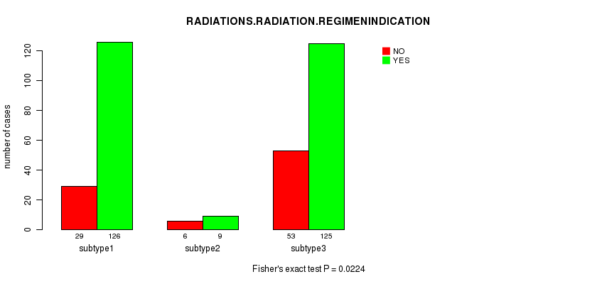 Figure S66. Get High-res Image Clustering Approach #11: 'MIRseq Mature CNMF subtypes' versus Clinical Feature #6: 'RADIATIONS.RADIATION.REGIMENINDICATION'