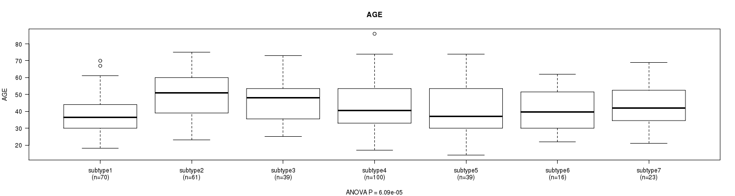 For continuous numerical clinical features, one-way analysis of variance (Howell 2002) was applied to compare the clinical values between tumor subtypes using 'anova' function in R