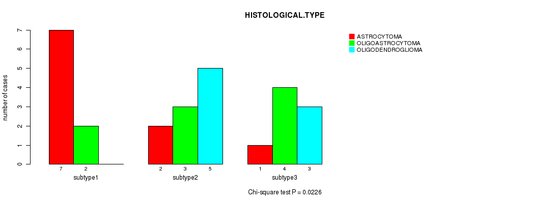 3 subtypes identified in current cancer cohort by 'MIRSEQ CHIERARCHICAL'. These subtypes correlate to 'HISTOLOGICAL.TYPE'.