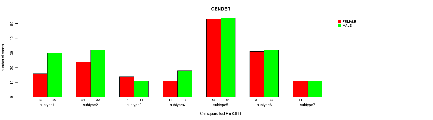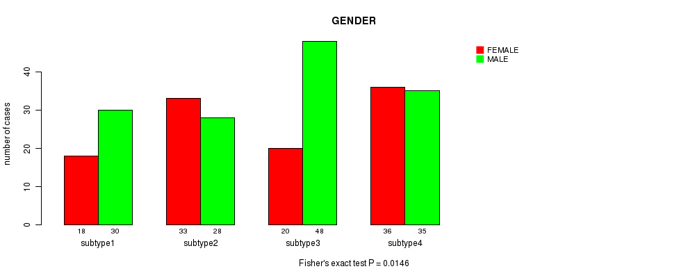 Table S74. Clustering Approach #11: 'MIRseq Mature CNMF subtypes' versus Clinical Feature #3: 'GENDER'