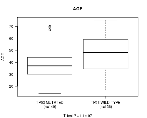 Figure S4. Get High-res Image Gene #5: 'TP53 MUTATION STATUS' versus Clinical Feature #2: 'AGE'