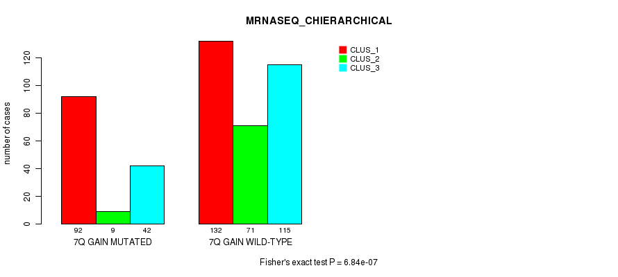 7q gain cnv correlated to 'CN_CNMF', 'METHLYATION_CNMF', 'MRNASEQ_CNMF', 'MRNASEQ_CHIERARCHICAL', 'MIRSEQ_CNMF', and 'MIRSEQ_MATURE_CNMF'.
