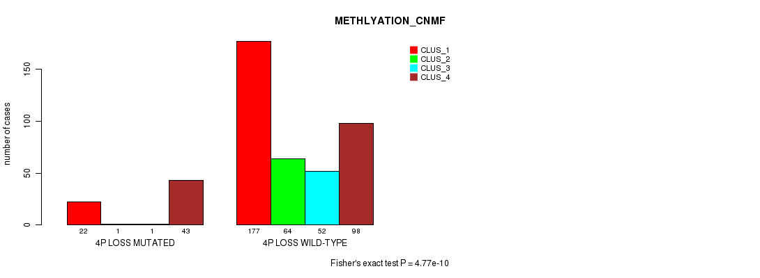 4p loss cnv correlated to 'METHLYATION_CNMF', 'MRNASEQ_CNMF', and 'MRNASEQ_CHIERARCHICAL'.