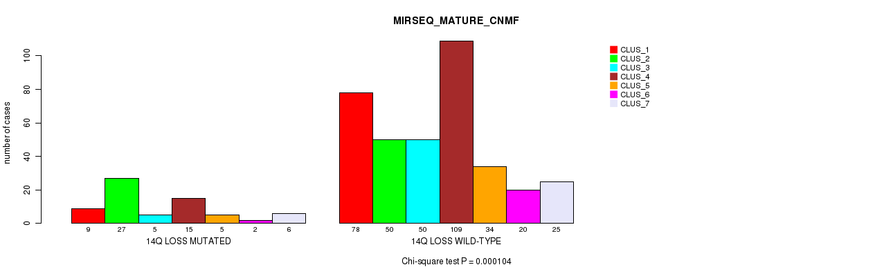 14q loss cnv correlated to 'METHLYATION_CNMF', 'MRNASEQ_CNMF', and 'MIRSEQ_MATURE_CNMF'.
