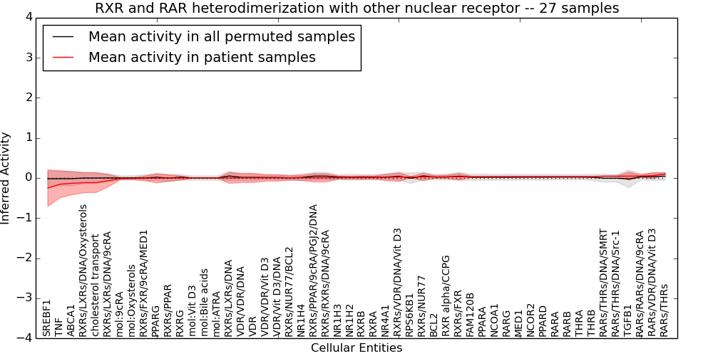 Figure S131. Get High-res Image This plot shows pathway concept perturbations across all samples against a permutation model. The concepts along the x-axis are sorted by lowest to highest mean activity for the real patient samples. Mean inferred activities are plotted along the y-axis as a colored band showing the average level and one standard deviation range. Real samples are shown in red and permuted samples in black.
