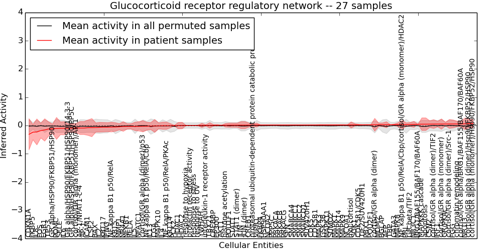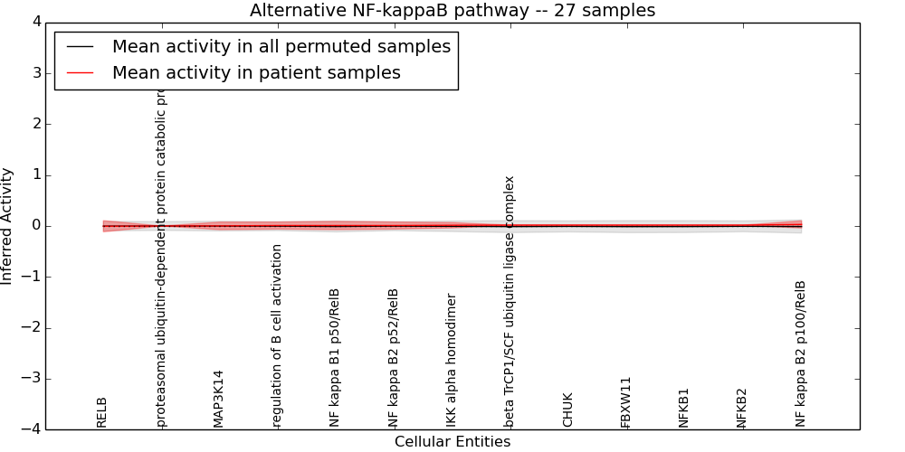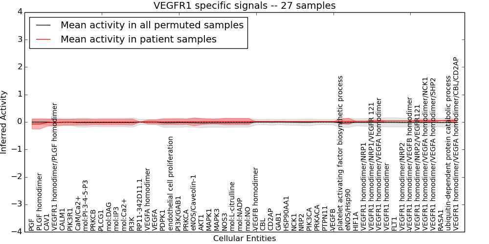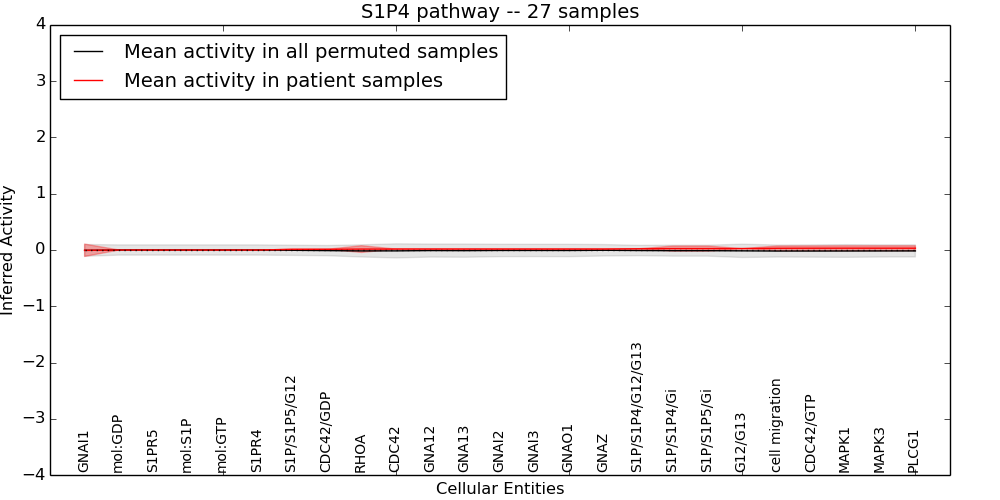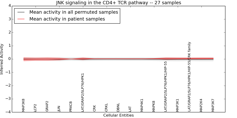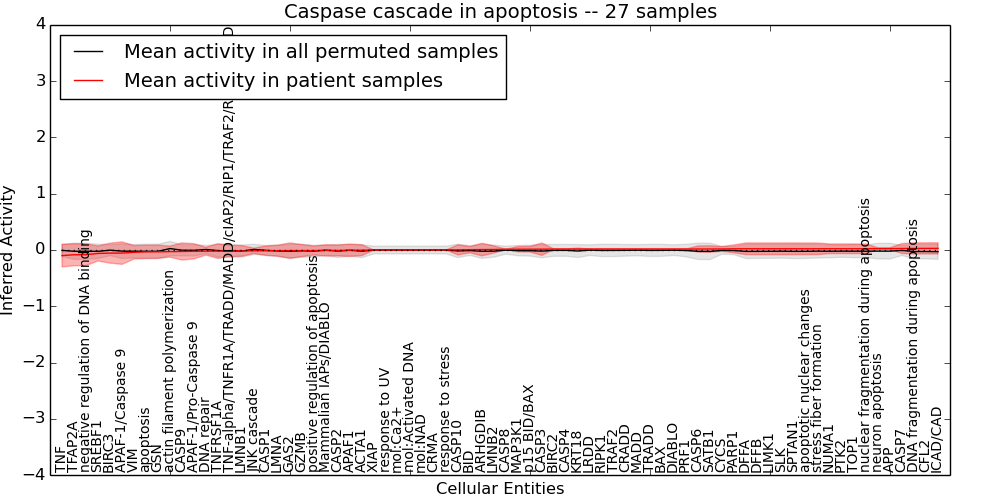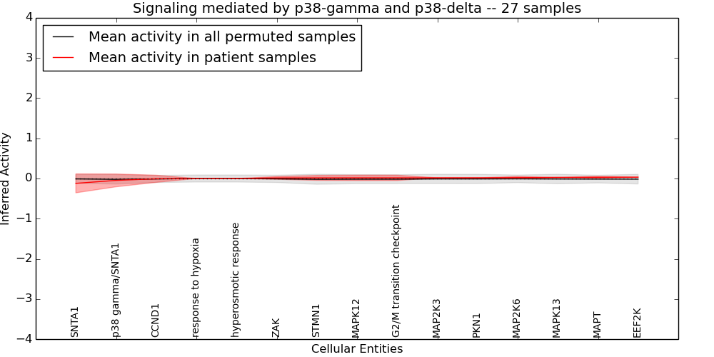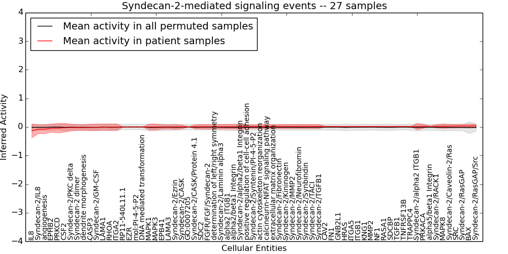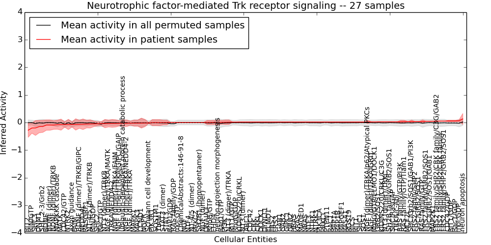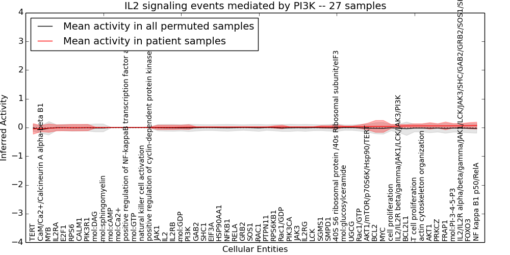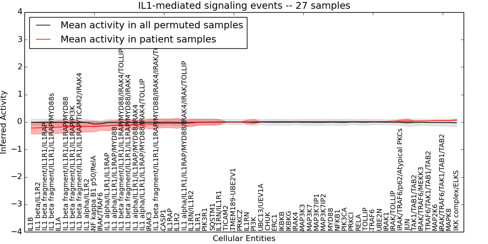 Figure S131.  Get High-res Image This plot shows pathway concept perturbations across all samples against a permutation model. The concepts along the x-axis are sorted by lowest to highest mean activity for the real patient samples. Mean inferred activities are plotted along the y-axis as a colored band showing the average level and one standard deviation range. Real samples are shown in red and permuted samples in black.