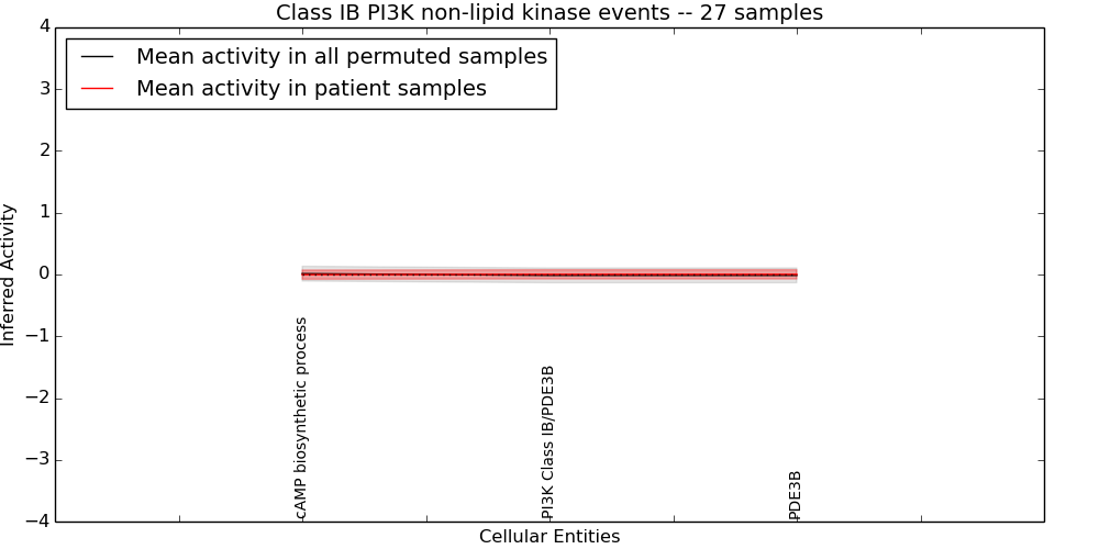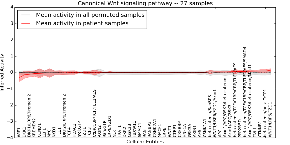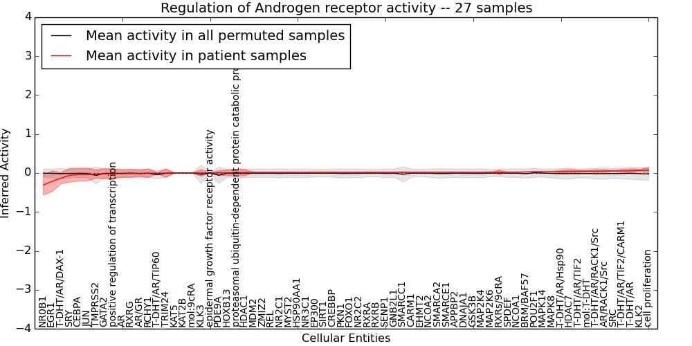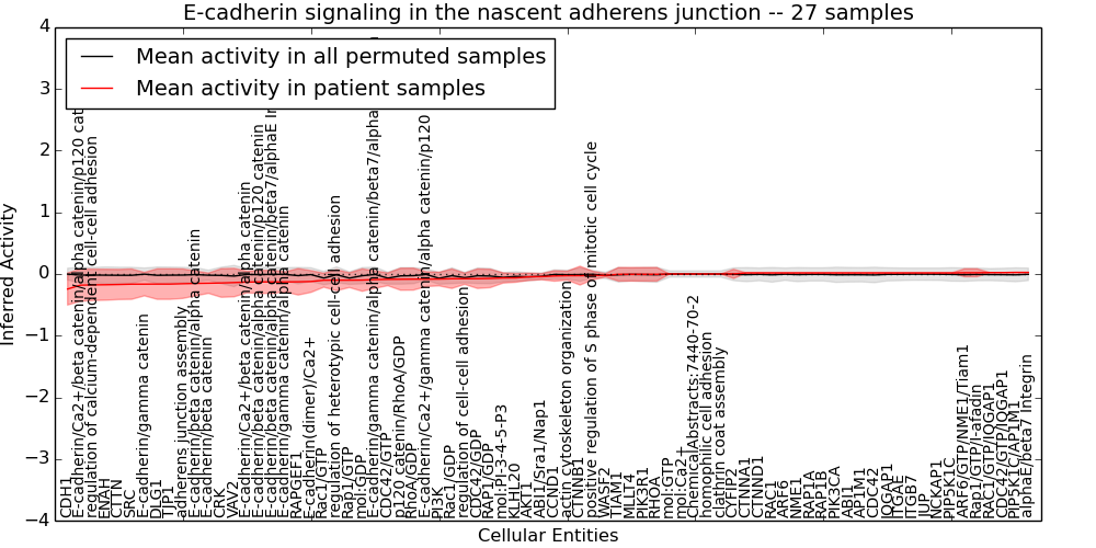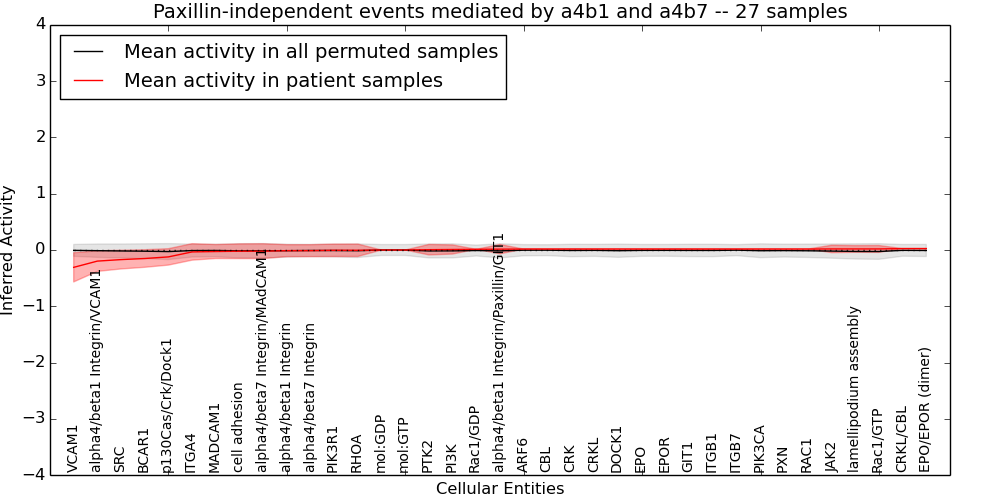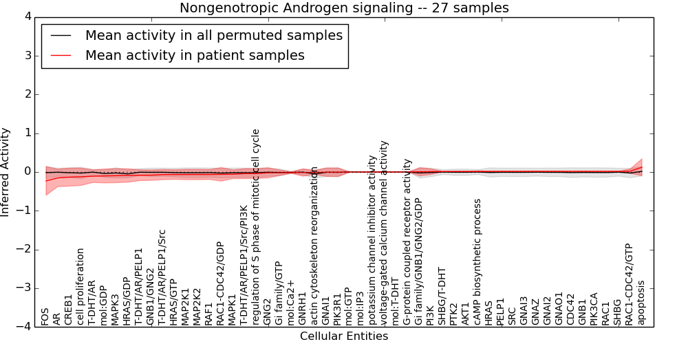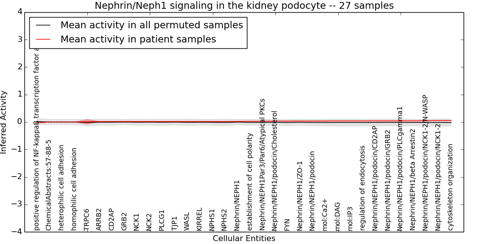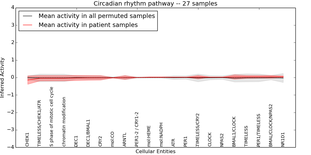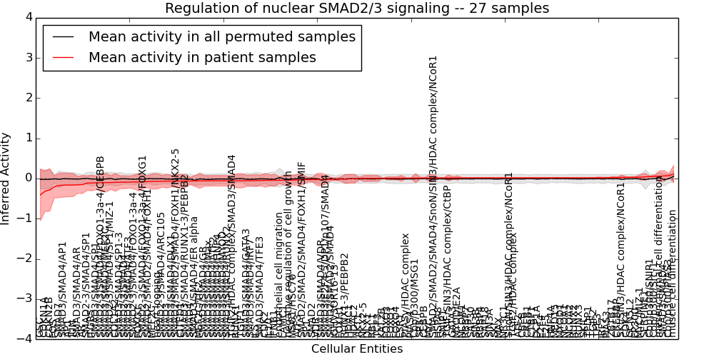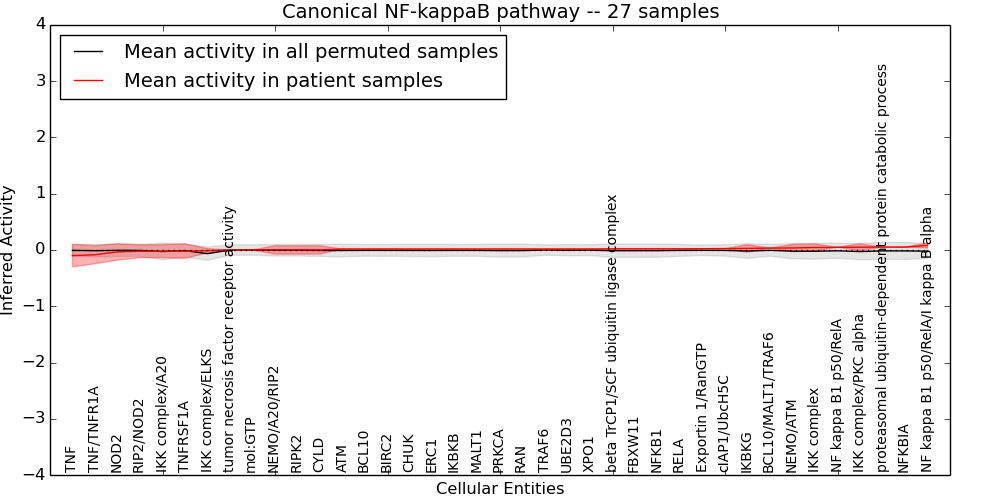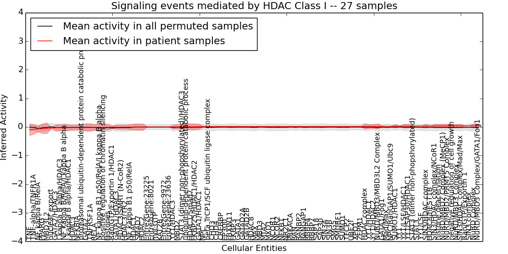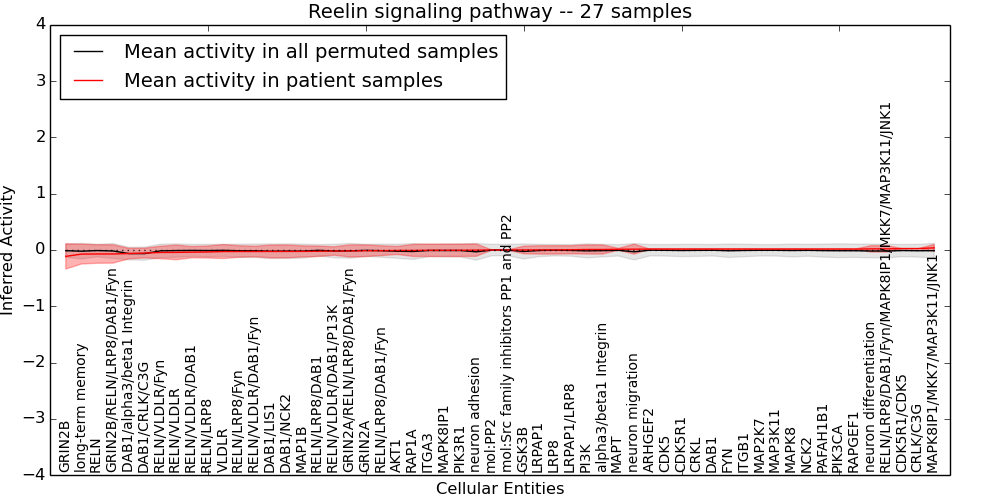 Figure S131.  Get High-res Image This plot shows pathway concept perturbations across all samples against a permutation model. The concepts along the x-axis are sorted by lowest to highest mean activity for the real patient samples. Mean inferred activities are plotted along the y-axis as a colored band showing the average level and one standard deviation range. Real samples are shown in red and permuted samples in black.