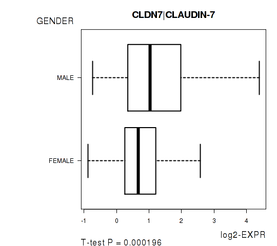 Figure S2. Get High-res Image As an example, this figure shows the association of CLDN7|CLAUDIN-7 to 'GENDER'. P value = 0.000196 with T-test analysis.