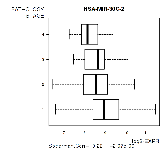 Figure S1. Get High-res Image As an example, this figure shows the association of HSA-MIR-30C-2 to 'PATHOLOGY.T.STAGE'. P value = 2.07e-06 with Spearman correlation analysis.