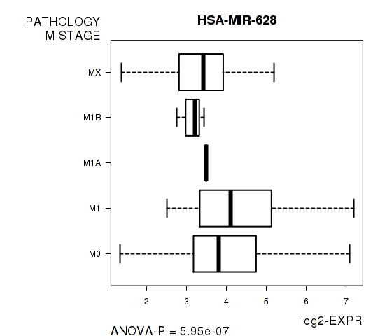 Figure S2. Get High-res Image As an example, this figure shows the association of HSA-MIR-628 to 'PATHOLOGY.M.STAGE'. P value = 5.95e-07 with ANOVA analysis.