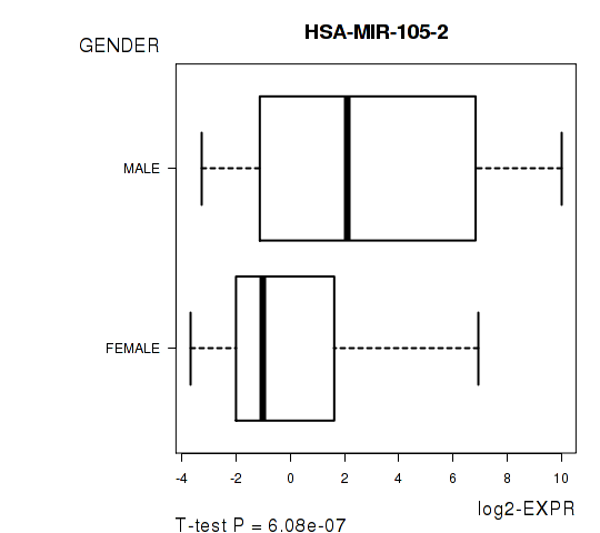 Figure S3. Get High-res Image As an example, this figure shows the association of HSA-MIR-105-2 to 'GENDER'. P value = 6.08e-07 with T-test analysis.