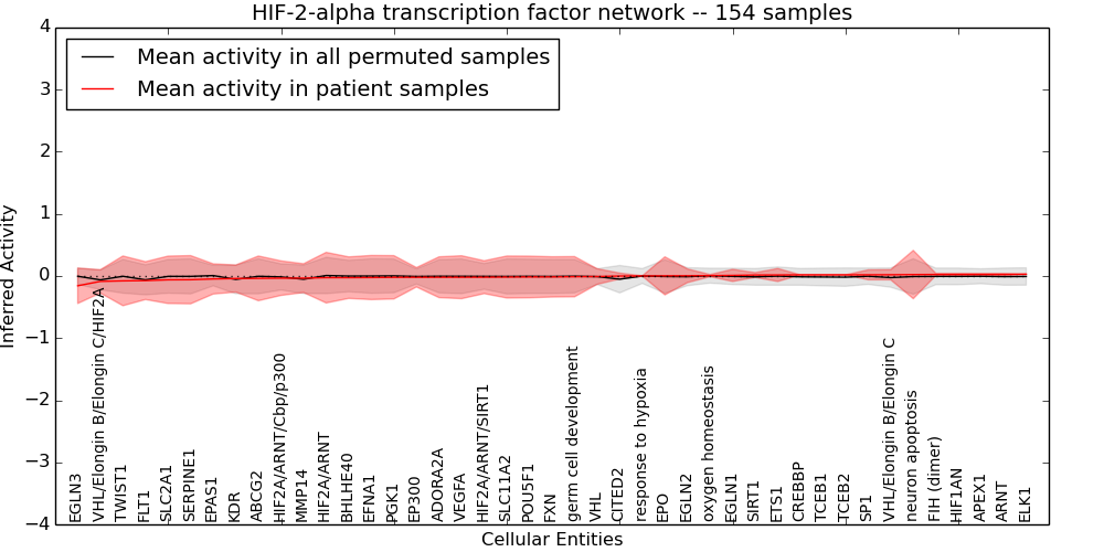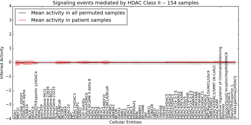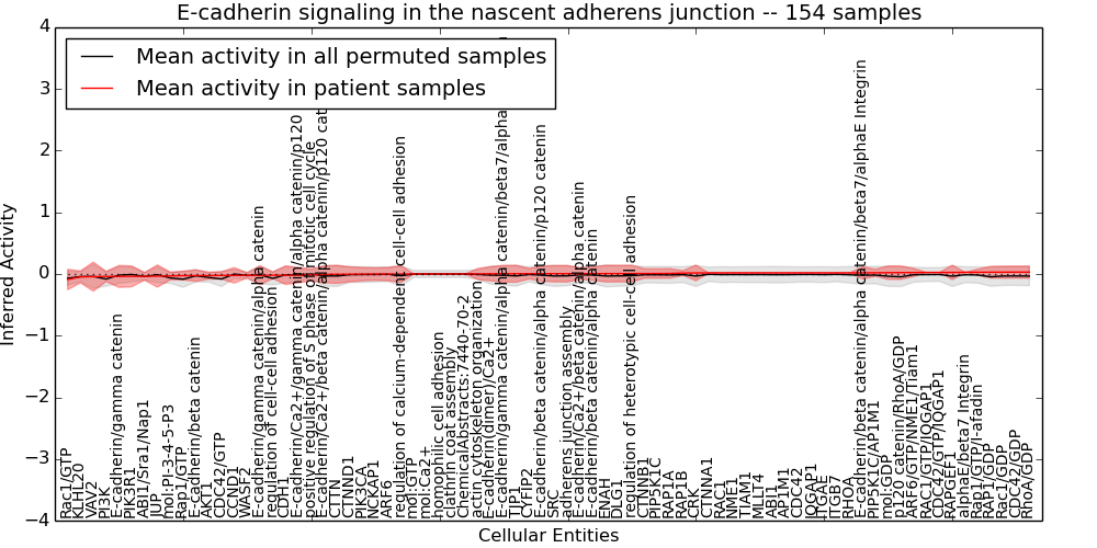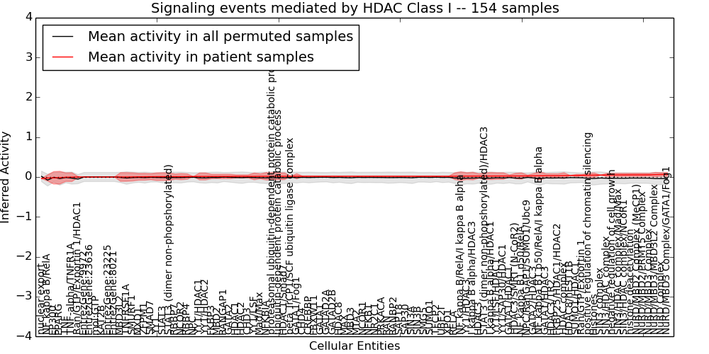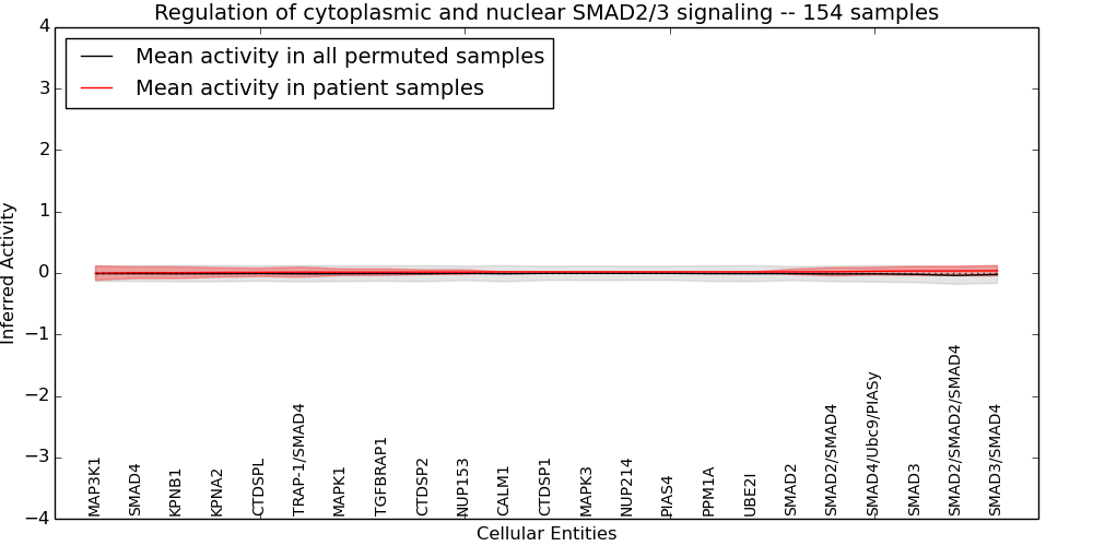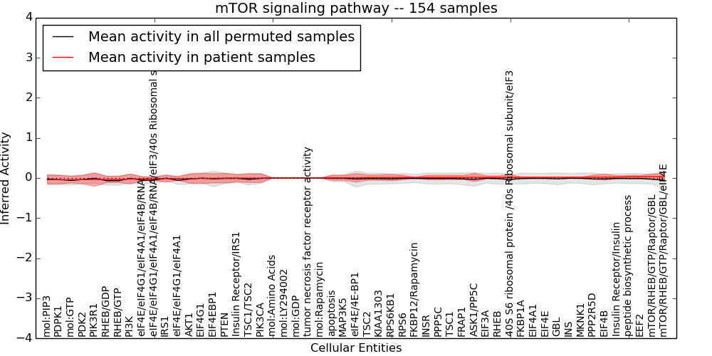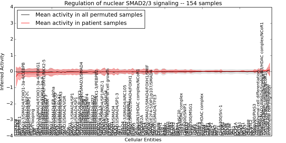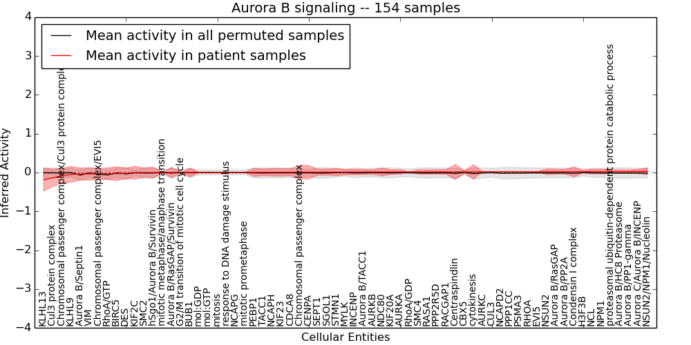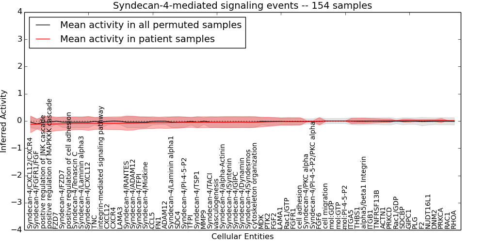 Figure S131.  Get High-res Image This plot shows pathway concept perturbations across all samples against a permutation model. The concepts along the x-axis are sorted by lowest to highest mean activity for the real patient samples. Mean inferred activities are plotted along the y-axis as a colored band showing the average level and one standard deviation range. Real samples are shown in red and permuted samples in black.