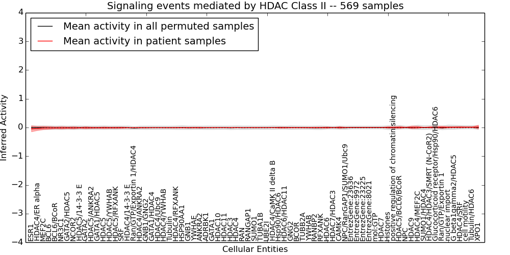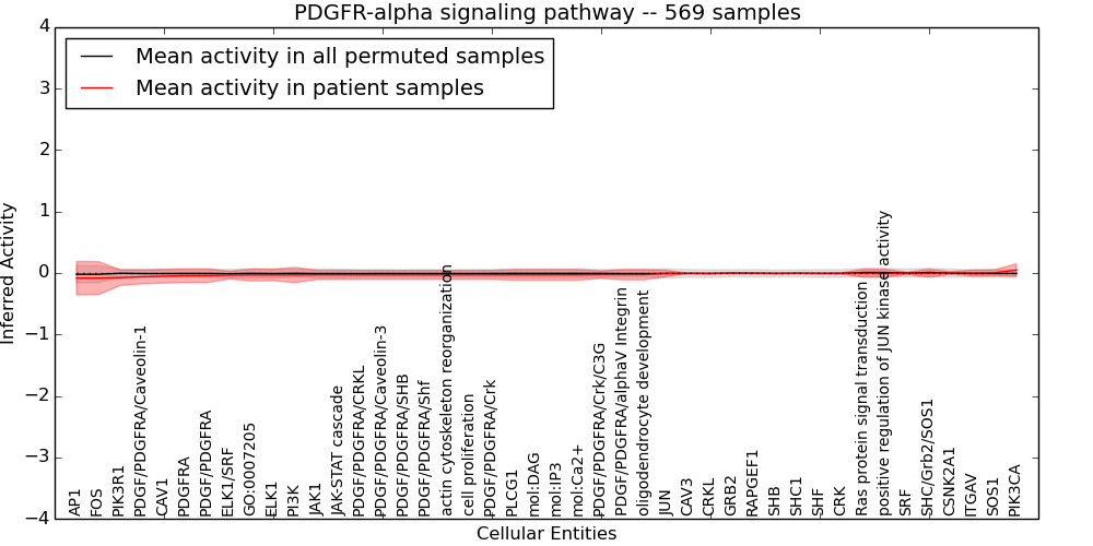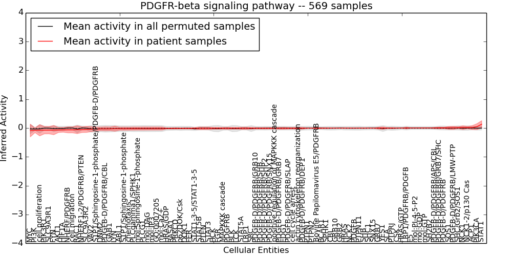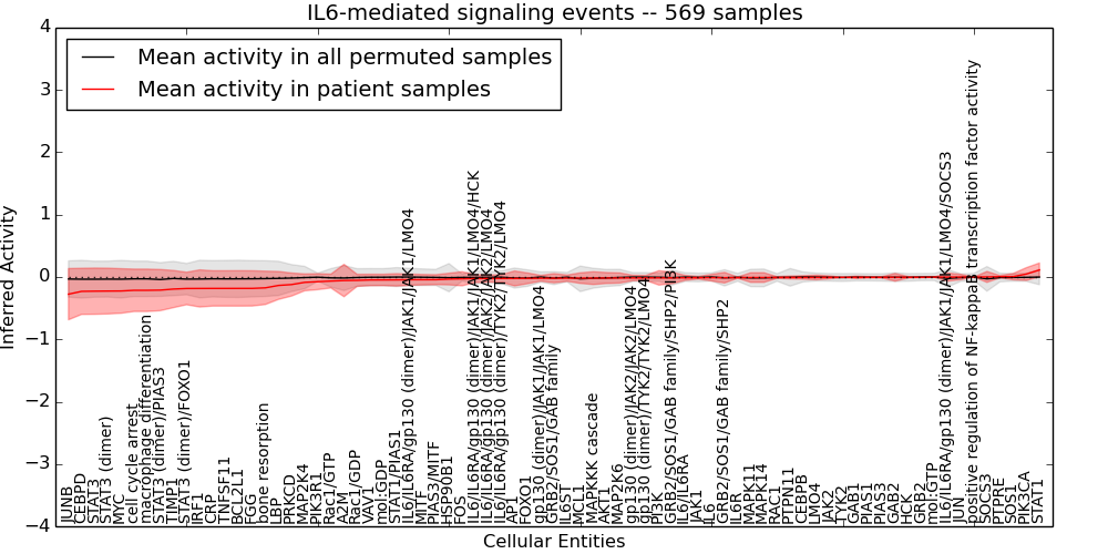 Figure S131. Get High-res Image This plot shows pathway concept perturbations across all samples against a permutation model. The concepts along the x-axis are sorted by lowest to highest mean activity for the real patient samples. Mean inferred activities are plotted along the y-axis as a colored band showing the average level and one standard deviation range. Real samples are shown in red and permuted samples in black.