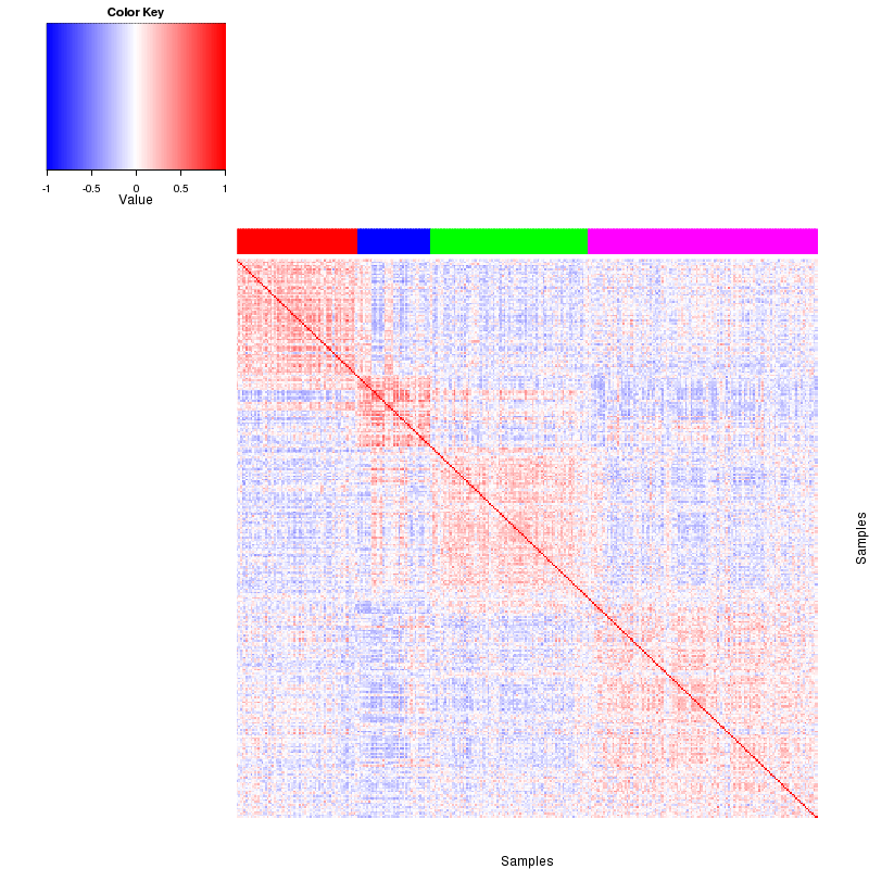 Figure 4.  The consensus matrix after clustering shows 4 robust clusters with limited overlap between clusters.