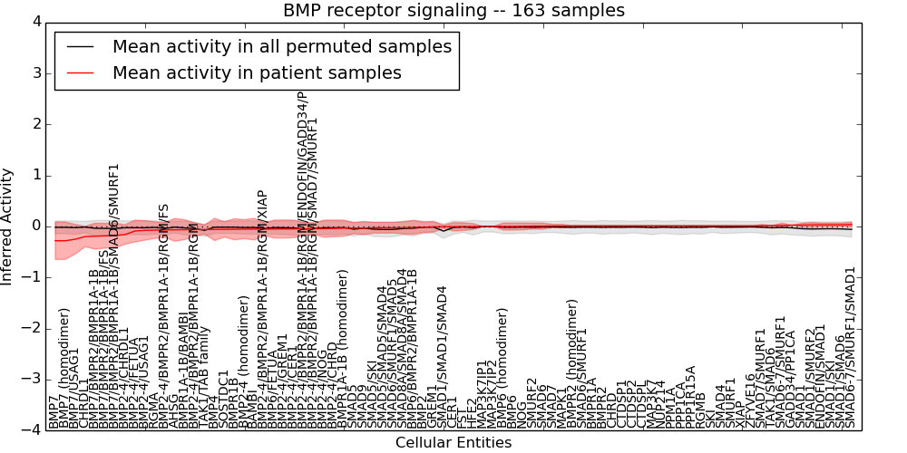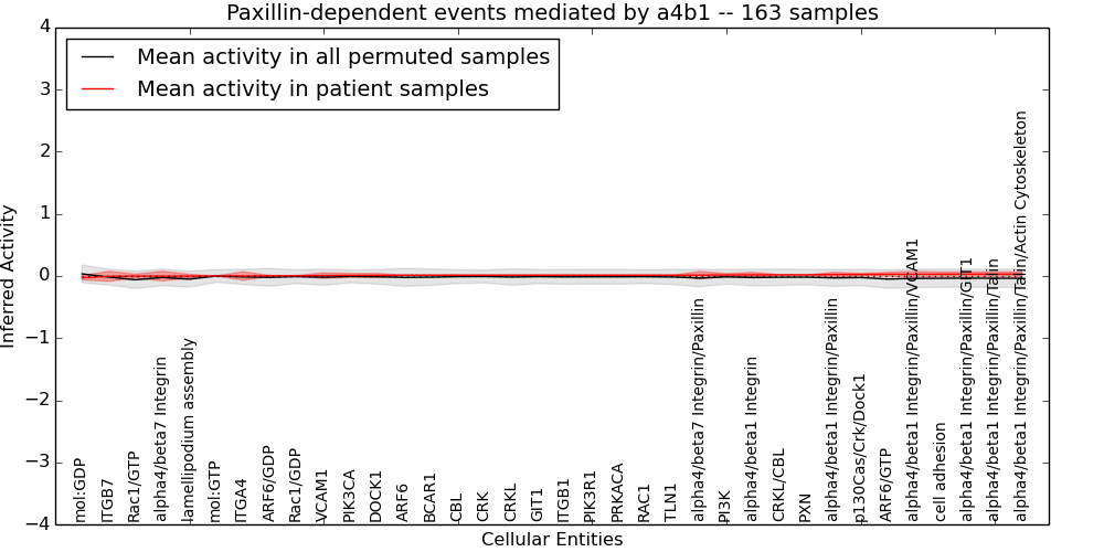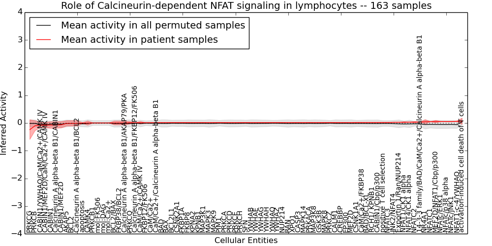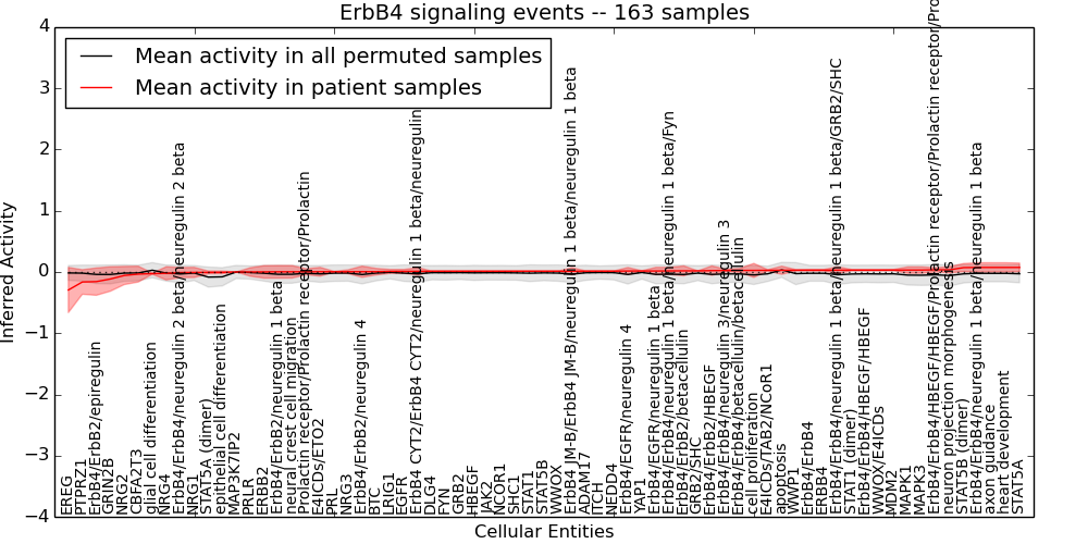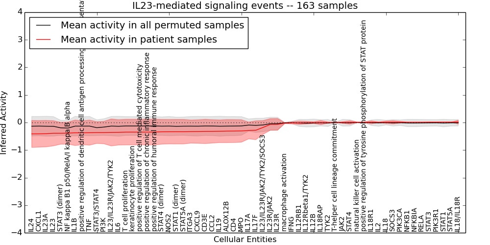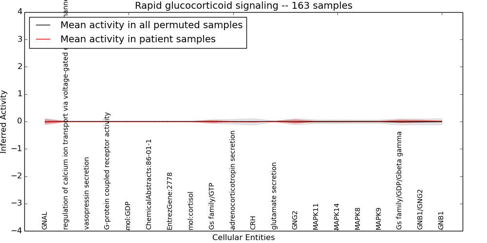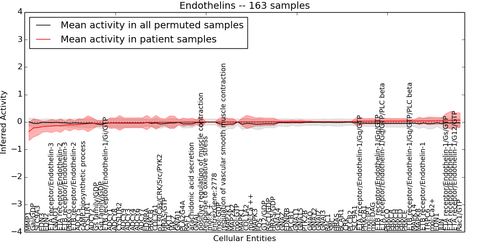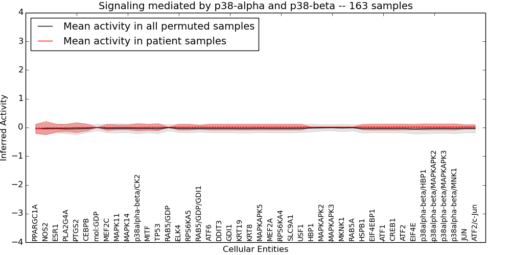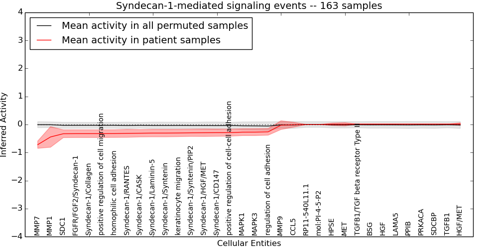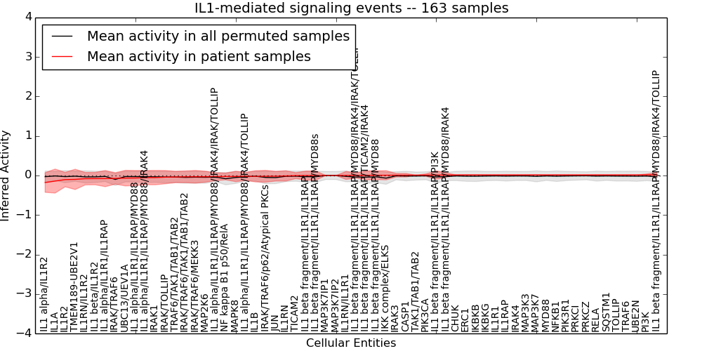 Figure S131.  Get High-res Image This plot shows pathway concept perturbations across all samples against a permutation model. The concepts along the x-axis are sorted by lowest to highest mean activity for the real patient samples. Mean inferred activities are plotted along the y-axis as a colored band showing the average level and one standard deviation range. Real samples are shown in red and permuted samples in black.
