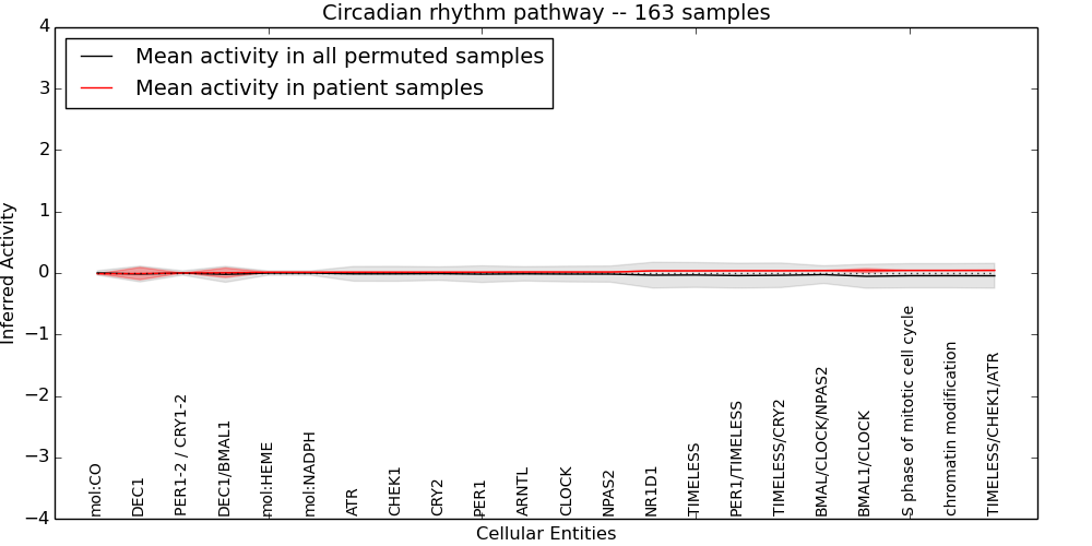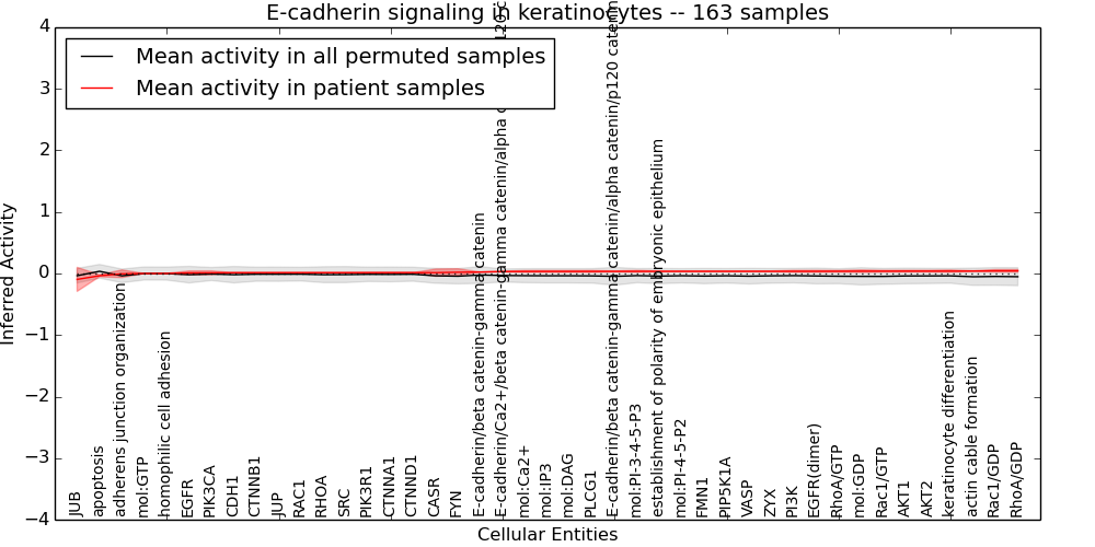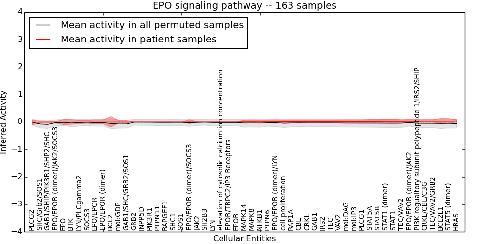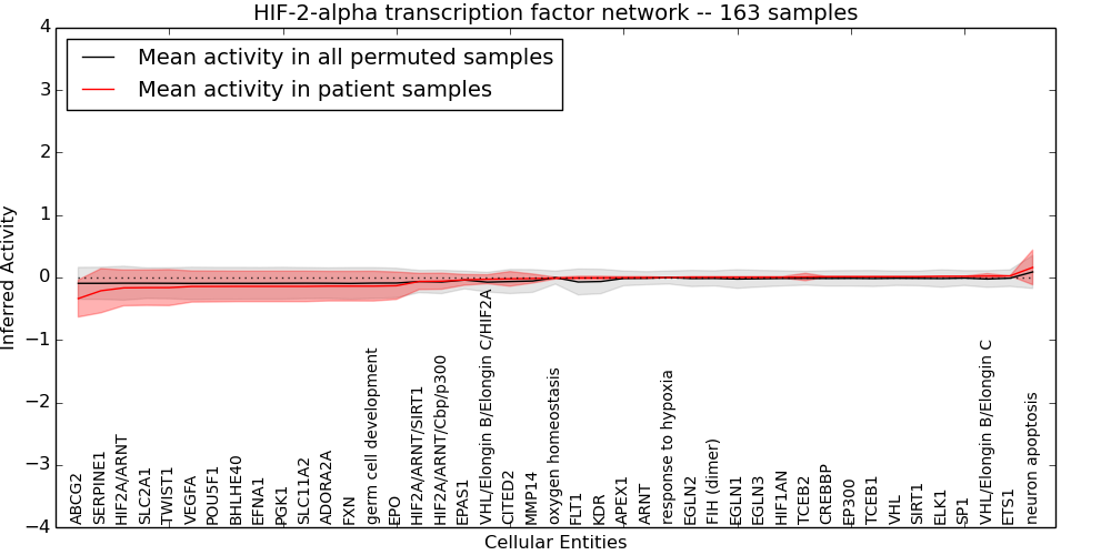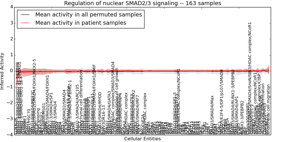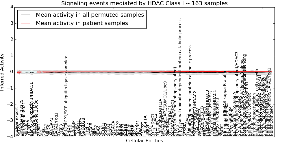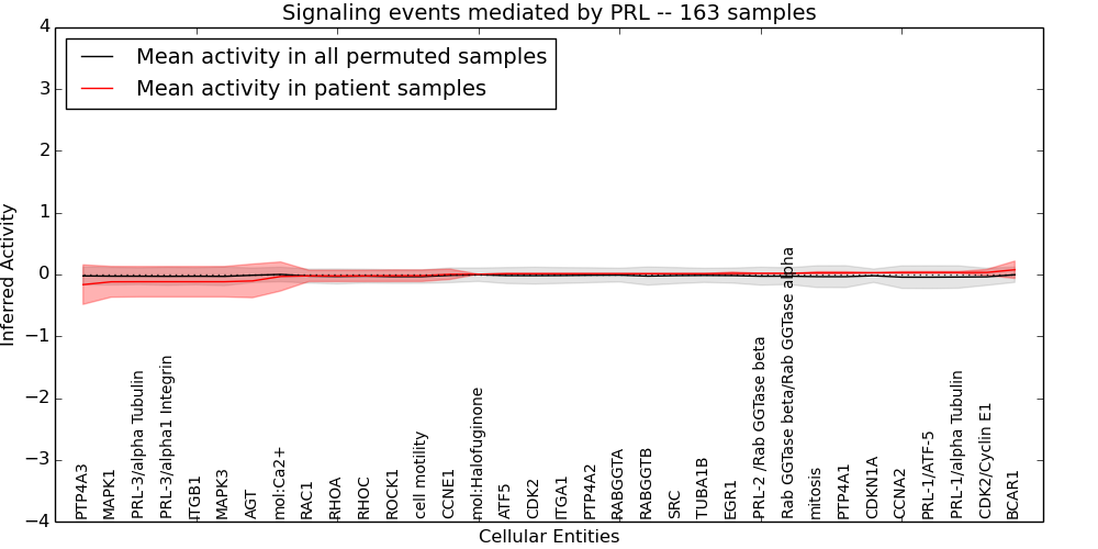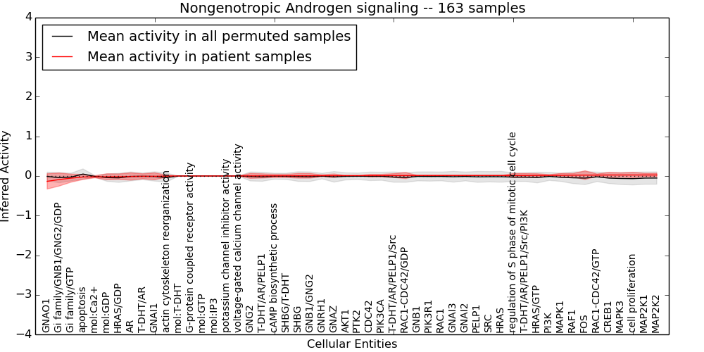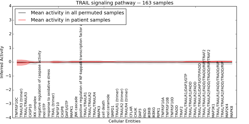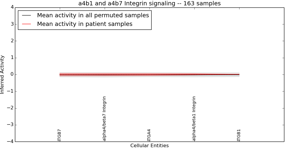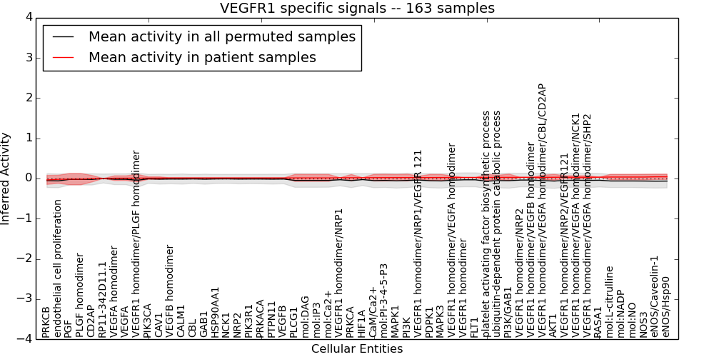 Figure S131.  Get High-res Image This plot shows pathway concept perturbations across all samples against a permutation model. The concepts along the x-axis are sorted by lowest to highest mean activity for the real patient samples. Mean inferred activities are plotted along the y-axis as a colored band showing the average level and one standard deviation range. Real samples are shown in red and permuted samples in black.