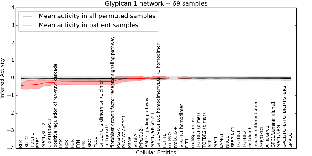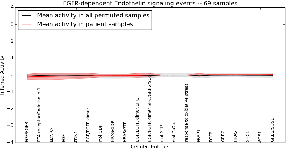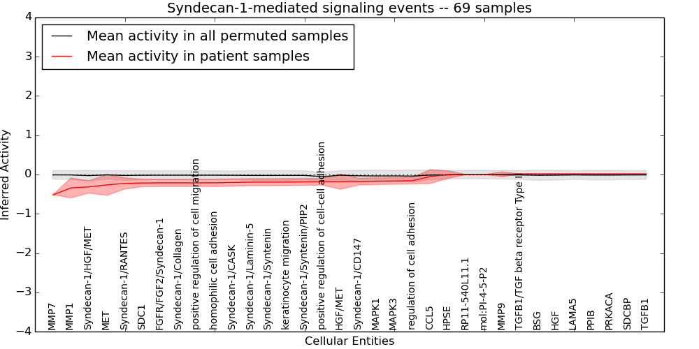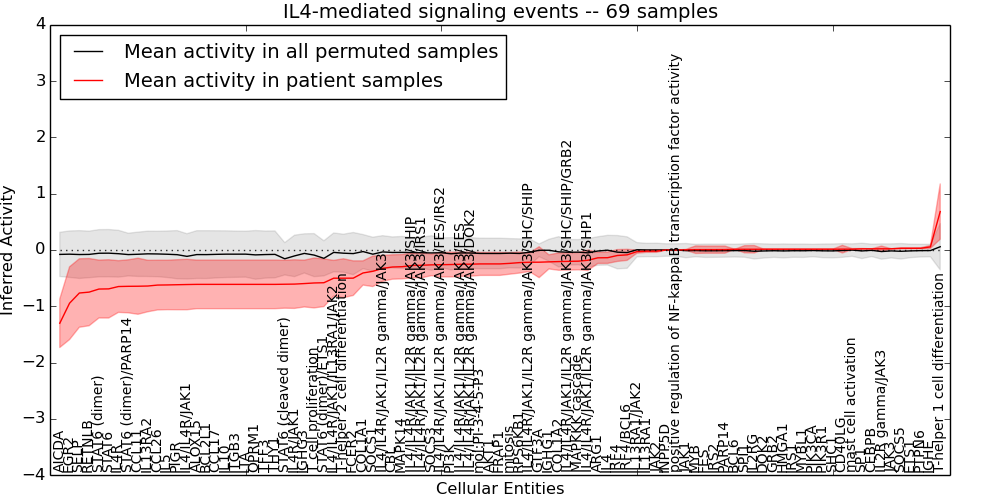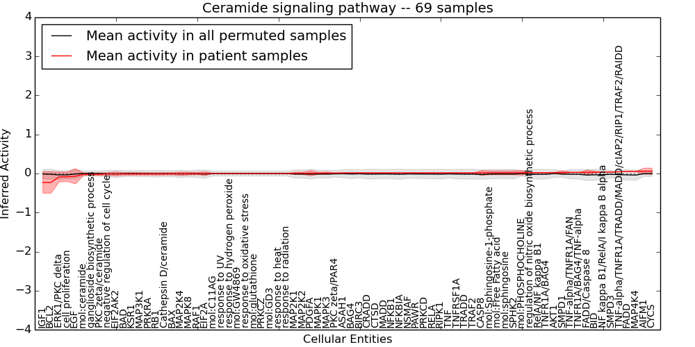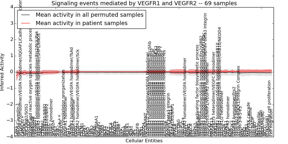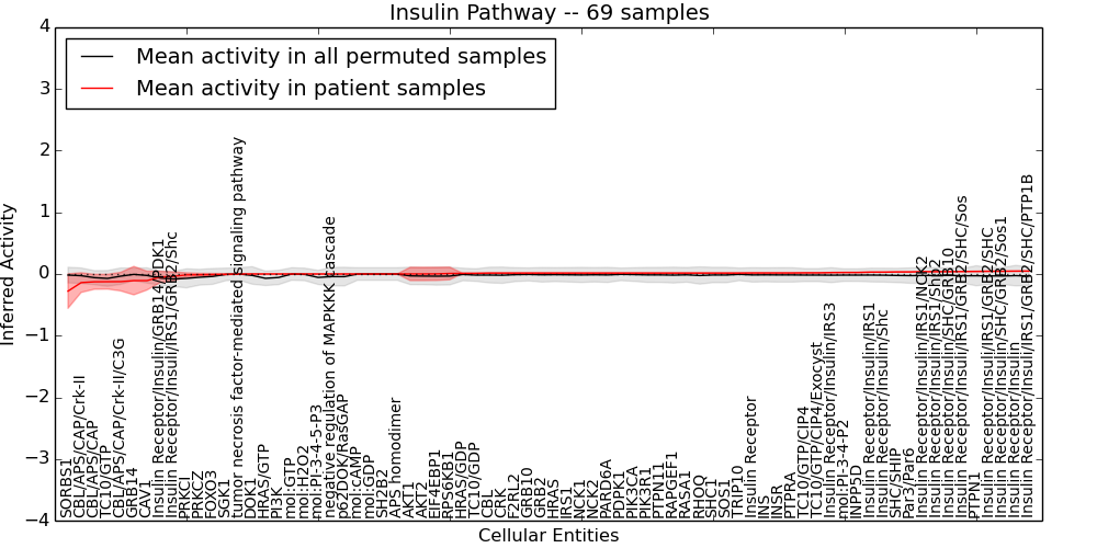 Figure S131. Get High-res Image This plot shows pathway concept perturbations across all samples against a permutation model. The concepts along the x-axis are sorted by lowest to highest mean activity for the real patient samples. Mean inferred activities are plotted along the y-axis as a colored band showing the average level and one standard deviation range. Real samples are shown in red and permuted samples in black.