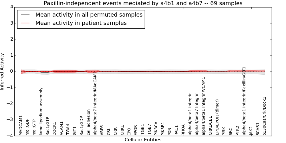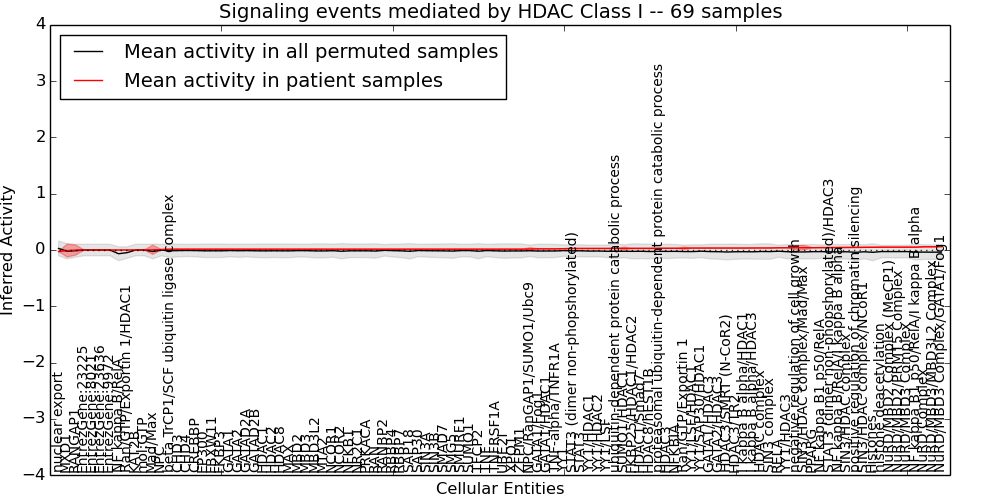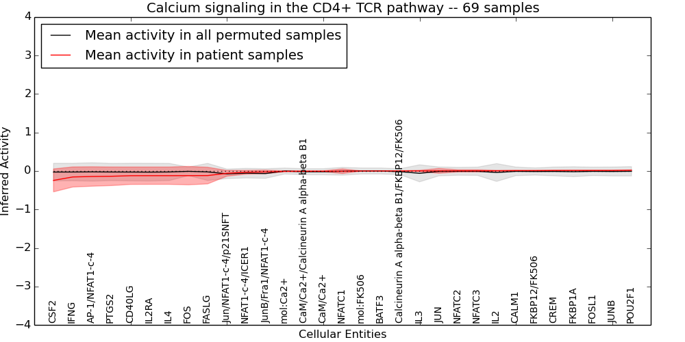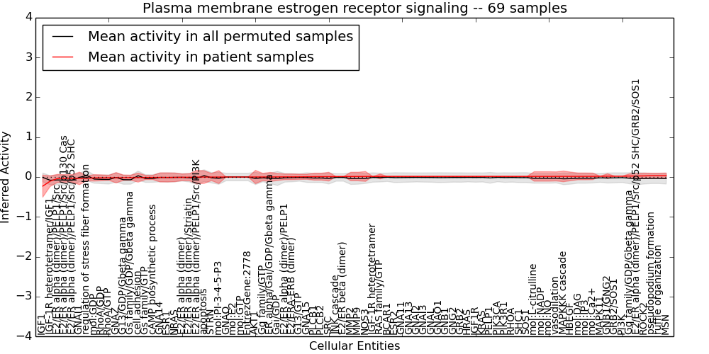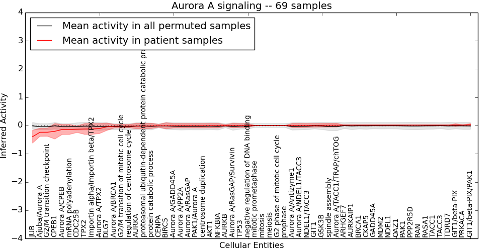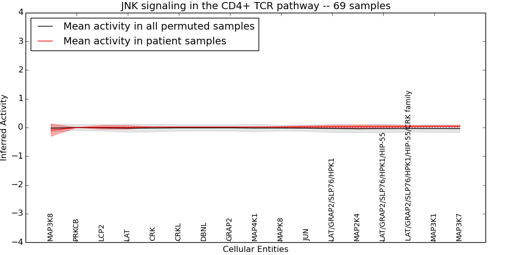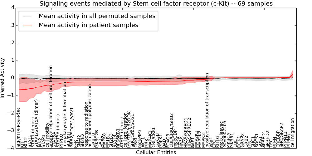 Figure S131. Get High-res Image This plot shows pathway concept perturbations across all samples against a permutation model. The concepts along the x-axis are sorted by lowest to highest mean activity for the real patient samples. Mean inferred activities are plotted along the y-axis as a colored band showing the average level and one standard deviation range. Real samples are shown in red and permuted samples in black.