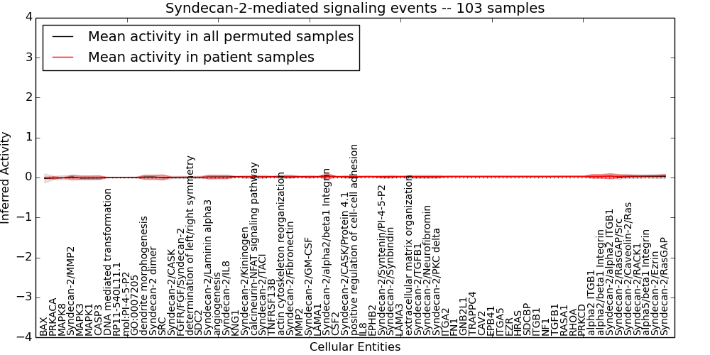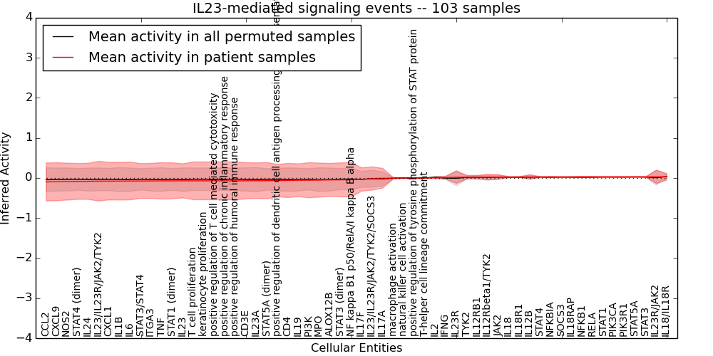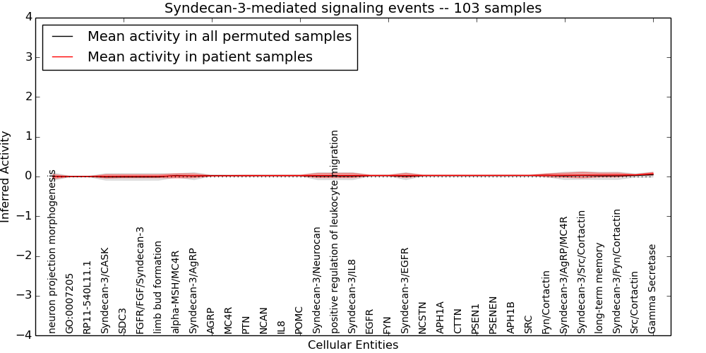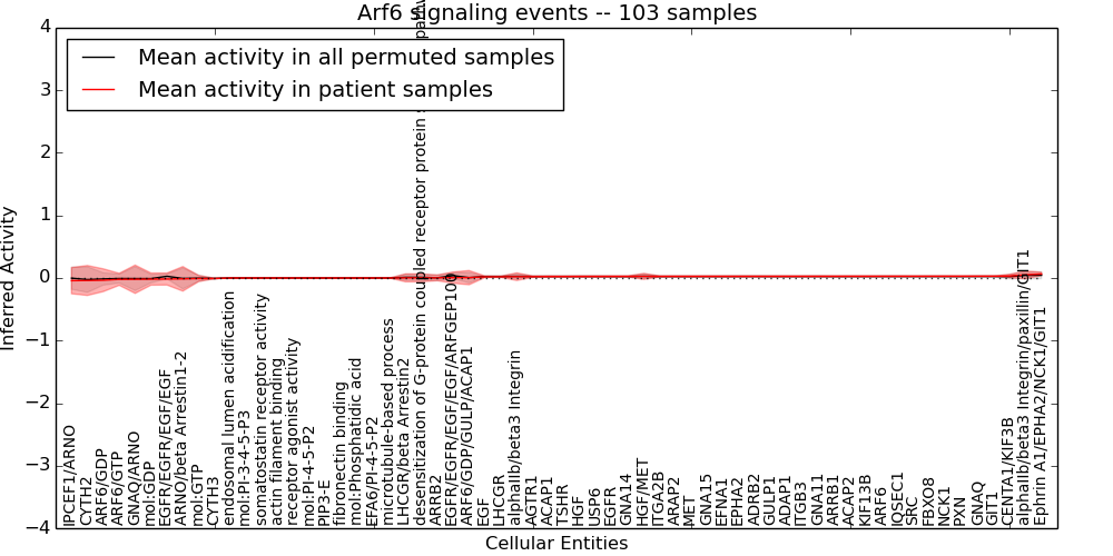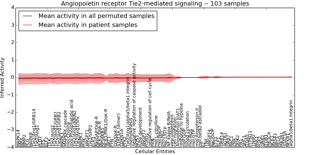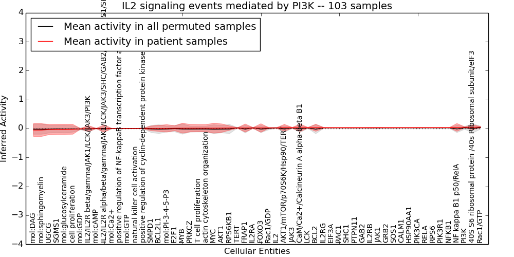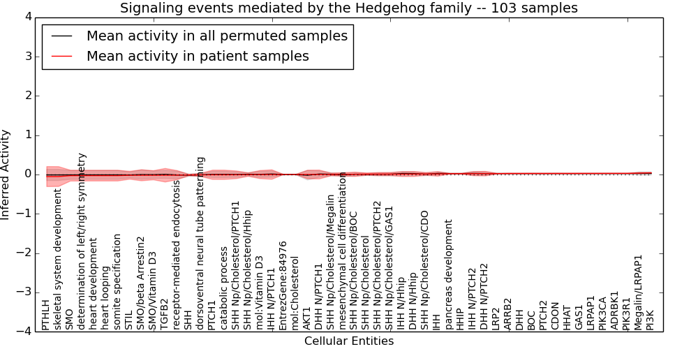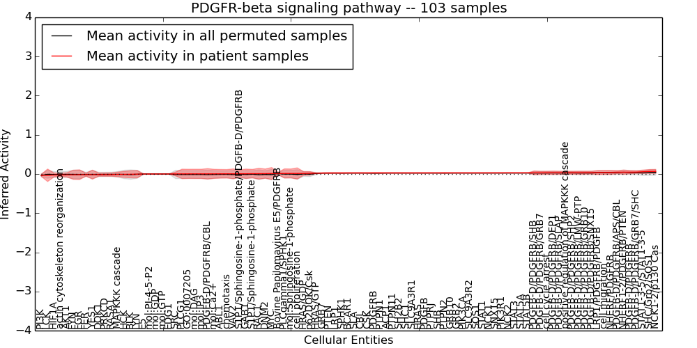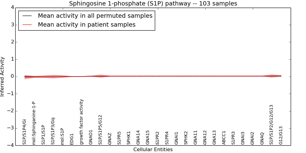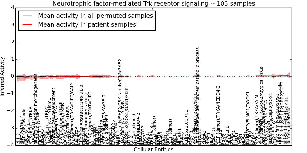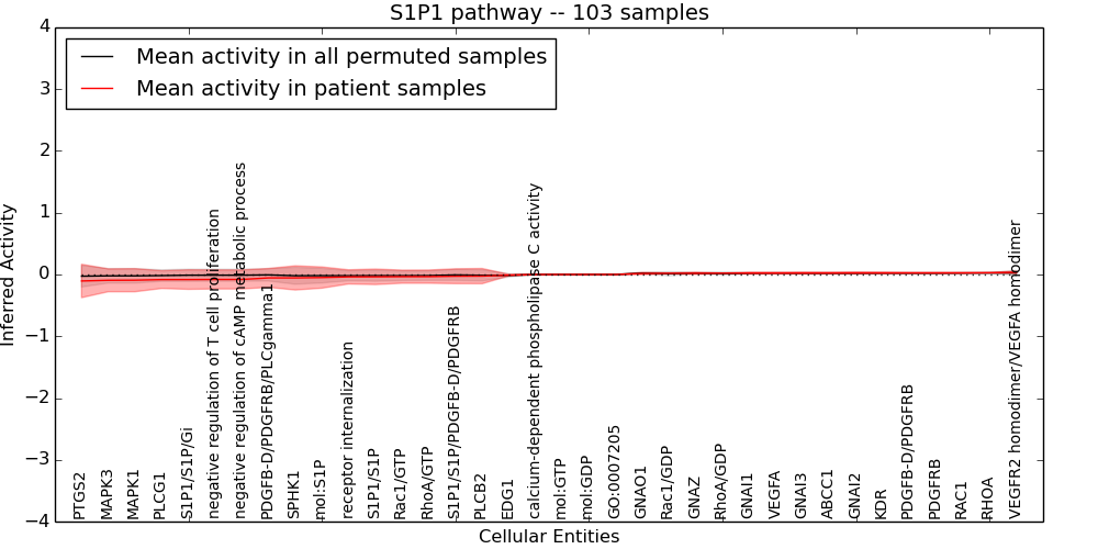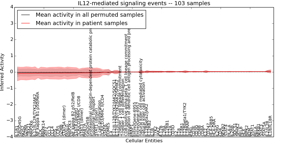 Figure S131. Get High-res Image This plot shows pathway concept perturbations across all samples against a permutation model. The concepts along the x-axis are sorted by lowest to highest mean activity for the real patient samples. Mean inferred activities are plotted along the y-axis as a colored band showing the average level and one standard deviation range. Real samples are shown in red and permuted samples in black.